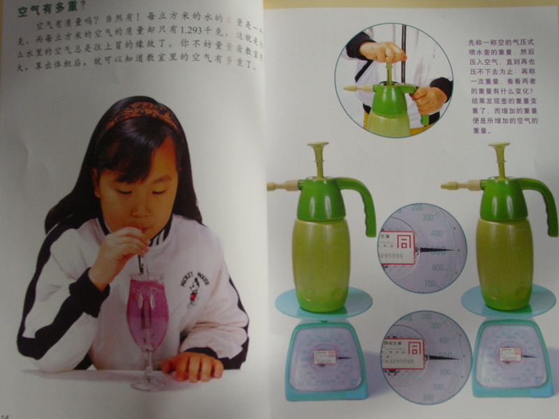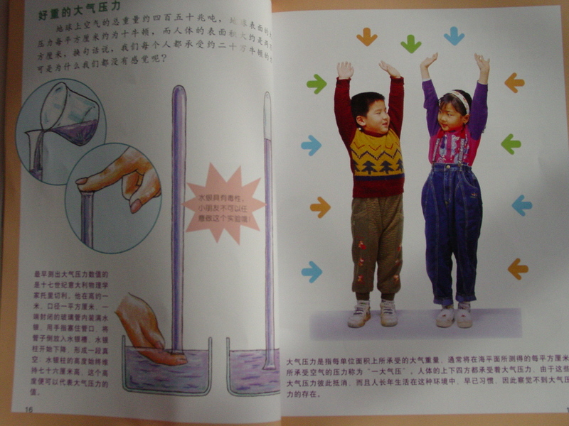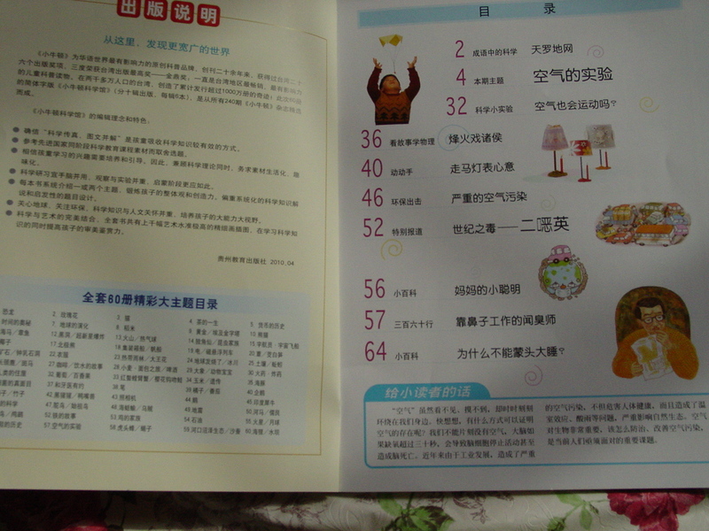 小牛顿科学馆一共有10辑,共60册,这一本关于空气实验的就是其中的第57册!它通过孩子喜欢的各种动手的实验,向孩子们讲述了5个主题 分别是 空气的实验,空气的运动 空气的污染 关于闻臭师的工作 还有我们为什么不能蒙头大睡的道理! 先来看目录,首先给孩子们从最熟悉的:“天罗地网”这个成语开始,接着是有趣的空气的实验,哈有听故事学习物理知识!动动手 等栏目! 空气是什么,它看不见摸不着,我们来详细的了解这空气的组成,空气是由氮气好氧气组成的,剩下的还有氩气和一些微量的其他气体!虽然空气看不见摸不着,可是空气也是有重量的哦! 让我们一起用一些小实验来验证空气的存在!让躲起来的空气都被抓出来!看到了同学们做的这些实验了吗?你也可以在家里自己做! 我们一起用酵母菌来产生空气,冲饱气球!这个实验会让孩子们睁大眼睛的!以为之前我为孩子做工这个实验!不过是用食用的醋和碱面一起做的! 性格沉稳的氮君子!竟然到了宁夏195.8°的时候才变成液态!看玫瑰花一到里面,马上就变成了干的!脆的!氮的循环的图示让孩子们对看不家的氮气有了更深的了解! 大 家都氧气的了解更深一些,氧气罐,输氧管等等,这些宝贝在医院探望病人的时候都看到过,了解过,对于氧气很熟悉,但是要这么详细的去了解,还真的是第一次!估计宝贝到了上中学,读这本书也会有收获! 看漂亮的霓虹灯,原来都与我们的那些空气中的一些稀有气体有关系哦!知道不同颜色的灯都是哪种气体发出的吗? 亲自测量一下空气的质量,才知道空气真的是有重量的哦! 知道自己能够承受多少的大气重量吗?我们每天都承受着来自上下四方的大气压力!因为大气压力彼此抵消了 所以我们就感觉不到哦! 知道波义耳定律吗?我们也可以自己动手做一做!只需要空笔杆,竹筷,橘子皮就可以了,一起来动手做一做吧! 为什么有时候,这茶壶盖子上的小孔被堵住了,水剧流不出来了呢!为什么热汤上的碗很难拿下来吗?在这里你可以找到答案! 风看不见,它是从哪里来的呢?那是空气在流动哦!放过孔明灯吗?正月十五一起去放许愿灯吧,为什么灯可以飞起来呢?自己动手做实验,一切都明白了! 书中有太多太多的有趣的实验,孩子们想要知道的问题,打开书我们才知道这些有趣的知识!一起带着孩子来看这些有趣的科普吧,小牛顿会让你在玩乐中学到很多很多! 阳非常非常的喜欢小牛顿,从小时候看过的小小牛顿过度到现在的小牛顿,宝贝的成长离不开好书! 自己动手来做这些有趣的实验吧!做一个爱探索的孩子,做一个求知上进的中国少年! 本作品未经作者许可不得转载,转载请征求作者意见。擅自转载使用,将保留追究其法律责任的权利!