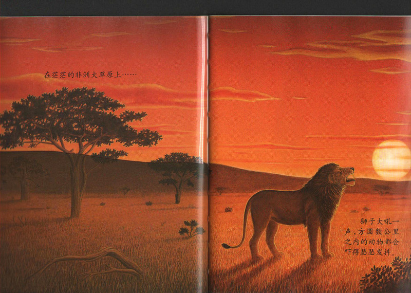 黄昏的非洲大草原,美丽而神秘。夕阳西下,我们可以看到一头雄狮在吼叫。 “ 狮子大吼一声,方圆数公里之内的动物都会吓得瑟瑟发抖。”——为什么动物都怕狮子呢? “ 大家都说狮子是百兽之王。在非洲,狮子是最大的猫科动物。”——因为狮子有像剃刀一样的尖牙,还有弯弯的钩爪。 雄狮和雌狮有什么不同之处?——“雌狮是没有鬃毛的。” 狮子的祖先是剑齿虎。就像大象的祖先是猛玛象一样。——我们看过冰河世纪。儿子对猛玛象很有印象。 所有猫科动物中,只有狮子喜欢群居生活。狮子们是如何分工合作的呢?狮子妈妈如何养育它的小宝宝的呢?狮子王是如何产生的呢?它们喜欢的猎物都有哪些动物呢?
