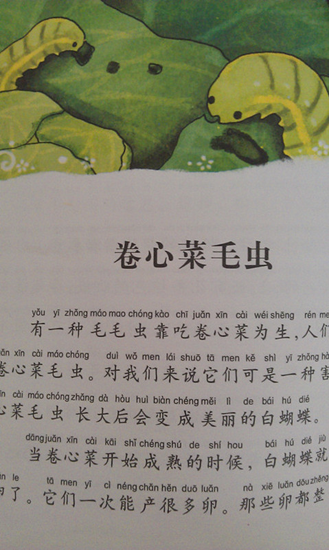 《卷心菜毛虫》 卷心菜毛虫,很多小朋友都有见过哦!沐儿说不喜欢它,觉得有点害怕,呵呵,长得确实有点恐怖啊!它喜欢吃卷心菜,所以应该算是害虫喽!不过卷心菜毛虫长大后会变成美丽的白蝴蝶哦,小女生都比较喜欢蝴蝶的,女儿每次作画时,总爱在旁边画个小蝴蝶,追赶蝴蝶的小女孩。 昆虫再厉害,还是有天敌的。正可谓一物降一物,卷心菜毛虫的天敌是“小侏儒”,这个名字有意思,因为一只卷心菜毛虫相当于六十多只名叫“小侏儒”的昆虫,哈哈,是不是很有趣啊! 昆虫的世界太有趣了,法布尔对小小昆虫的生活习性了如指掌,是因为他是生活的有心人,我们也要做个有心人,大千世界,除了昆虫世界,还有更多的世界值得我们去探索!