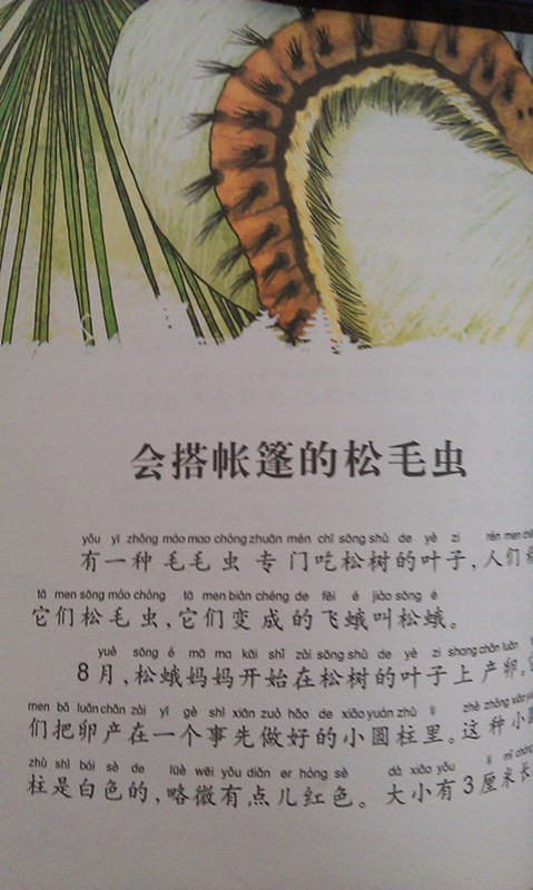 《会搭帐篷的松毛虫》 为什么叫松毛虫呢?原来这种毛毛虫专门吃松树的叶子,由此得名哦!松毛虫变成的飞蛾称之为松蛾,很好听的名字哈! 松蛾妈妈很厉害的,一次可以产300颗白色的卵,类似于玉米的穗子,而且排列得很整齐哦! 别看昆虫小,每个昆虫都有独特的本领。松毛虫也不例外,它会搭帐篷,小朋友们经常外出郊游,对帐篷一定也不陌生哦!看看可爱的松毛虫是如何搭帐篷的呢?它们用自己吐出的丝编织成一张大网,然后把网罩在周围的松树叶上,帐篷就搭建成功了,哦,简直是太聪明了。 不过,人无完人,昆虫也是如此哦!尽管松毛虫是搭建帐篷的高手,但它却不爱讲卫生,蜕的皮和吃剩的叶片到处乱放,帐篷里到处都是垃圾。