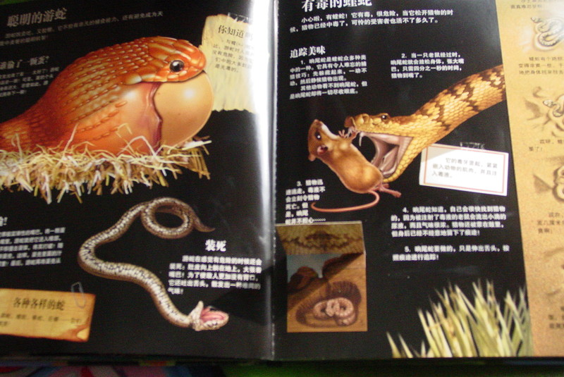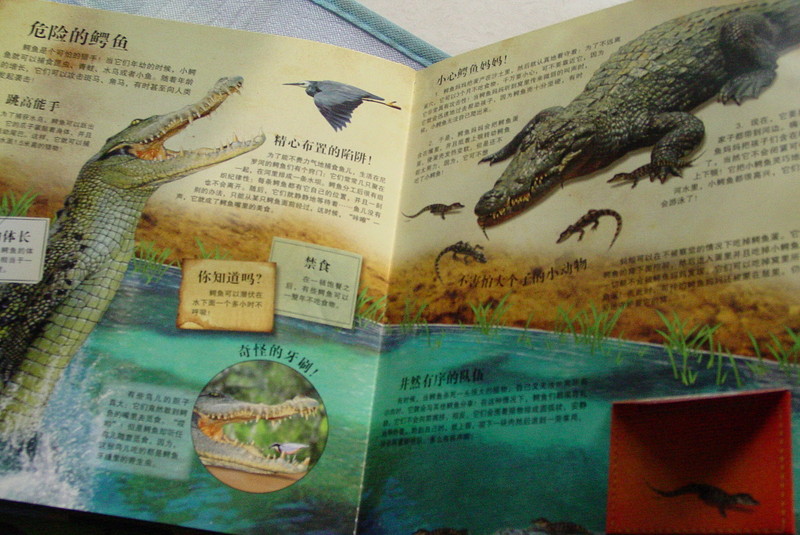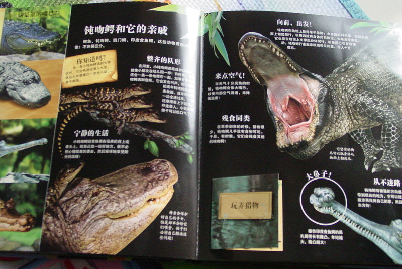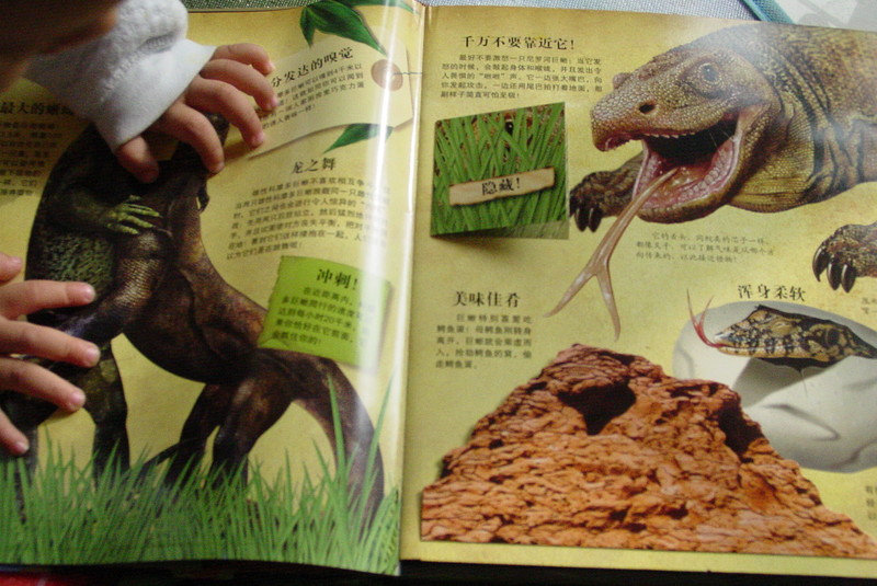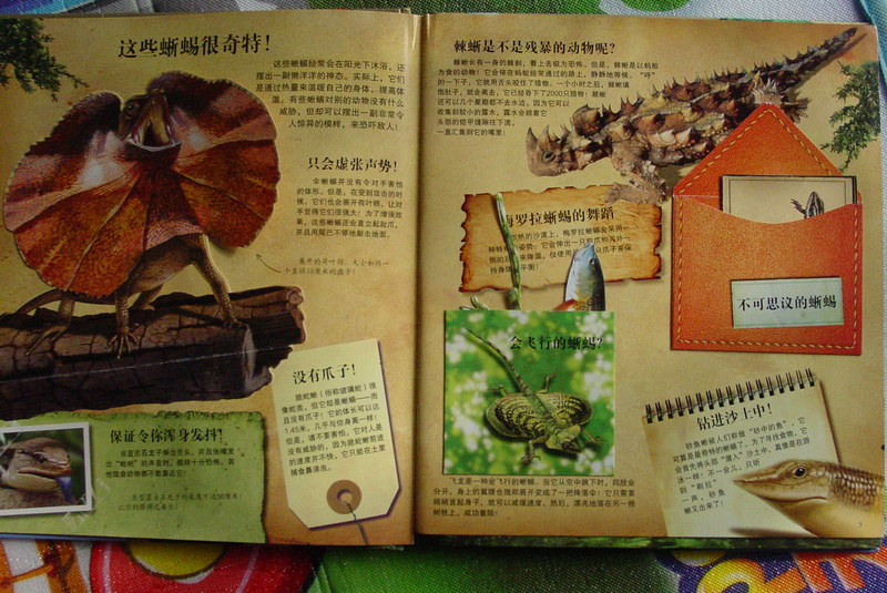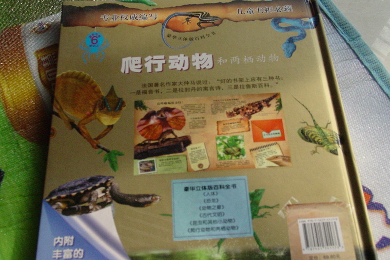 这本乐乐趣童书作为俩宝贝的圣诞礼物,是再好不过的了!看7岁的哥哥和一岁的弟弟都对一打开是就冒出来的这只大蜥蜴感到非常的惊奇!大蜥蜴的样子非常的逼真,特别是嘴巴里面的那条蛇,吼吼,妈妈都被吓的倒退几步,可是1岁多的弟弟竟然跑上去摸摸人家的大嘴巴,亲亲那小蛇!哈哈,这胆子也太大了!根本就不知道害怕啊!哥哥知道蜥蜴是喜欢吃蛇的哦,所以也不觉得奇怪,就是妈妈这一惊一乍的,让兄弟俩笑话了! 这是第二次在乐乐趣的天猫旗舰店买书了,之前都是在亚马逊买乐乐趣的童书,宝贝很喜欢,但是因为价格稍微高,所以买的也不多!虽然拍的时候,人家说可能会有瑕疵,但是收到以后,真的是超级棒,我用侦查员的眼睛去搜索,竟然没有发现一点儿瑕疵,反而找到了很多很多的惊喜! 这本被称为是好话立体版的百科全书,一套共有6本,分别是《人体》《恐龙》《动物之最》《古代文明》《昆虫和其他小动物》《爬行动物和两栖动物》相信男孩子都会喜欢这些,当然女孩子可能有些害怕,呵呵!比如我这个妈妈就被书中太真实的场景给吓的吱哩哇啦的! 这些奇特的蜥蜴,真的有点儿吓人,但是俩儿子都说很可爱,吼吼!书边还设计有小口袋,里面有知识卡片!介绍了好几种不同的蜥蜴!图片都非常非常的真实哦!见过会飞行的蜥蜴吗?飞龙就是那种会飞行的蜥蜴!身体会变成降落伞,是不是很神奇哦! 看蜥蜴虚张声势的时候就是这样,相机不给力哦,书上的图片超级逼真!这个图片四立体来以后拍的! 蜥蜴的种类好多好多,因为蜥蜴的身体会不停的根据周围的环境改变颜色,所以我们可以看到不同颜色,不同种类的蜥蜴! 看到这本书我才发现自己学士太浅,竟然有一些动物的名字不认识,编者很细心 还给了一些生僻字注音,超级感谢哦!看这一张,是不是非常非常的震撼!黑色的背景下,蜥蜴更加逼真! 妈妈看的心惊胆寒,rain竟然像蜥蜴一样的爬过来哦,亲爱的宝贝,你真爷们儿,异地阿尔都不怕,看到那蜥蜴伸出长长的舌头来了吗?看蜥蜴是如何隐藏自己的哦!世界上最大的蜥蜴竟然300多斤重!蜥蜴有非常发达的嗅觉!蜥蜴很聪明,会把自己的卵放进蚂蚁穴里面 让蚂蚁帮忙修复巢穴! rain对这本书的热爱是不是超过了哥哥,我拍照的时候,怎么都赶不走rain,哈哈 真是太喜欢了! 鳄鱼是非常危险的动物!非常可怕的猎手,年幼的鳄鱼就可以捕食各种昆虫,青蛙,水鸟,小鱼!大了可以攻击斑马,甚至还向人类进攻!鳄鱼还是跳高能手!还会布置陷阱!我的天,鳄鱼一顿饱食之后竟然可以一年都不吃食物,太厉害了!还可以潜伏在水下一小时都不呼吸,怪不得大家经常把鳄鱼的身体当做树干! 鳄鱼喜欢玩弄猎物,还会蚕食同类!在河里,小鳄鱼是成群结队的,就像幼儿园的小朋友一样!非常的听话! 游蛇贪吃又狡猾!它有非凡的捕食能力!还有避免成为天敌腹中美餐的聪明机智!虽然游蛇很厉害,都是它们都没有毒!它们的嘴巴好大啊竟然能够一口吃下这么大的蛋! 而蟒蛇比起游蛇来,也不示弱,蟒蛇有毒非常危险!只要被咬中,猎物都会中毒!所以很难逃掉! 来仔细看看蟒蛇是如何隐藏的哦!他们那边还喜欢在沙子里面乘凉!好聪明的蟒蛇啊,在沙子里面隐藏的天衣无缝,很难被发现,却可以监视敌人,猎物! 这一张 让我看的心惊胆寒,我跳过了! 眼镜蛇,吼吼 眼镜蛇业余自己的爱情,看这一对 相亲相亲的!真是好,如胶似漆 这词语应该是这样来的! 好可爱的海龟,看看这些刚被孵出来的小海龟!多么可爱啊!世界上最大的海龟是棱皮龟!在水中翱翔的海龟是不是非常的帅气呢!海龟也可以几个小时都不用呼吸,真是太厉害了! 这些龟类都有奇特的铠甲!虽然有些累赘 却可以保护自己!可以为自己遮风挡雨!到了恋爱的季节!雄性龟都会为自己的爱情而战,看来不管是人类 还是动物,爱情都是至上的! 知道这些美丽的颜色都是属于谁的吗?这些卡片的后面都有答案哦!宝贝们可以自己动手做一些知识卡片!收集起来! 书后面还备有一些问答游戏,宝贝看完这本书以后,就可以做一下测试,看看有木有记住这些重要的知识呢! 再来近距离的看一看这张超级炫的立体图片 吼吼 好吓人 好逼真!相机不给力 要不能够拍的更加的棒,让你有身临其境的感觉! 宝贝要求妈妈给他买回一整套,这个当然了,这么给力的好书,不收够一整套,妈妈也觉得可惜哦,宝贝的快乐童年就需要有乐乐趣的好书陪伴!才会更快乐,更充实! 本作品未经作者许可不得转载,转载请征求作者意见。擅自转载使用,将保留追究其法律责任的权利!