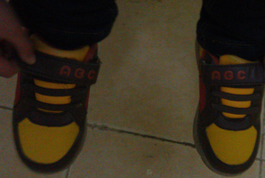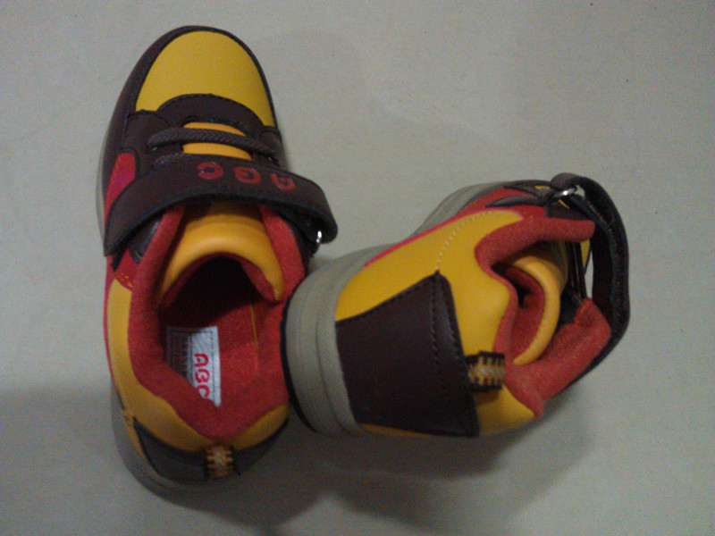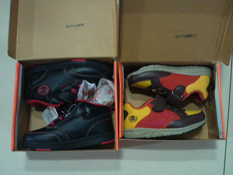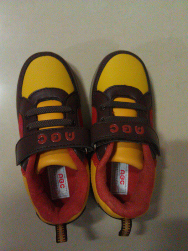 过了几天,买的ABC的鞋子终于来了,点点迫不及待地就要试穿,我们打开包裹,然后看见里面有两双鞋子,一双是红黑的,一双是黄色的,挺好看的,尤其是黄色的,很亮的颜色,做工也很细致,点点试了一下,穿着正好。