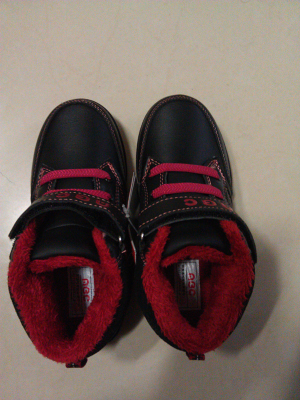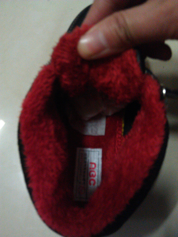 然后再试一下黑色的那一双,居然大很多,两双鞋买的是一个号码,都是内长是十八点八的,点点的较的脚长是十八,十八点八应该是正好,最后黑色的太大,不能穿,我觉得黑色那双很不错的,里面有红色的绒毛,穿着很舒服的,本来想着要换一双正好的,婆婆说只要买一双鞋垫就可以了,这样今年穿一下,明年也可以穿,我想这样也可以,就大一点吧,用鞋垫垫好就可以穿了。