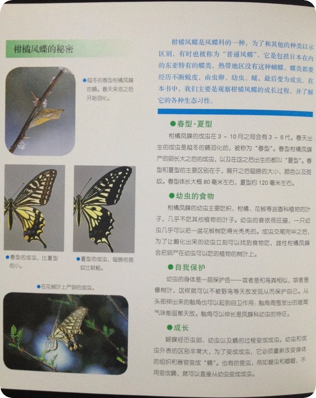 前几次阅读的时候,我都没有给她读最后这页关于柑橘凤蝶的介绍,说实话,我感觉有点枯燥,于是想当然的认为她不爱听。这一次,看时间还早,就给她读了,没想到她听得很认真,甚至还让我读了第二遍,真是刮目相看啊,看来真是不太了解小孩子哦,我也学到了一些知识,柑橘凤蝶的卵孵化出幼虫之后,主要吃枳、柑橘、花椒等植物的叶子,几乎不吃其他植物的叶子,还挺挑的,呵呵,跟我们以前的认识真是不同,以为什么叶子都吃呢。蝴蝶为了自己的宝宝一出生就有食物吃,就会把卵产在这些植物的树叶上,可怜天下父母心啊,都是一样一样滴!!