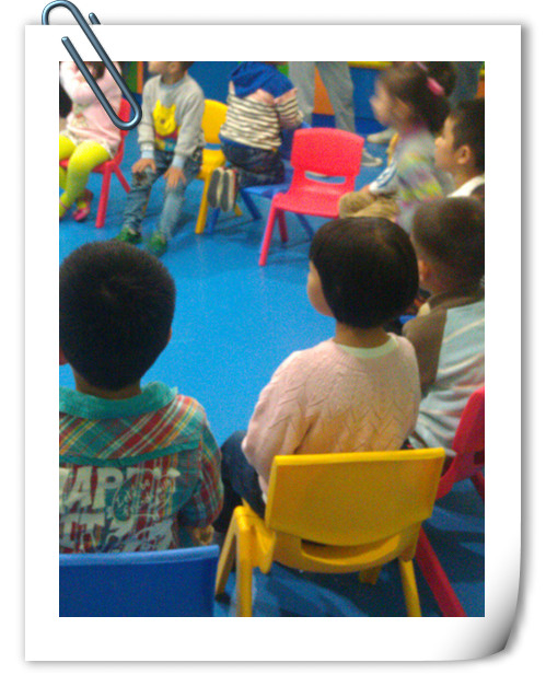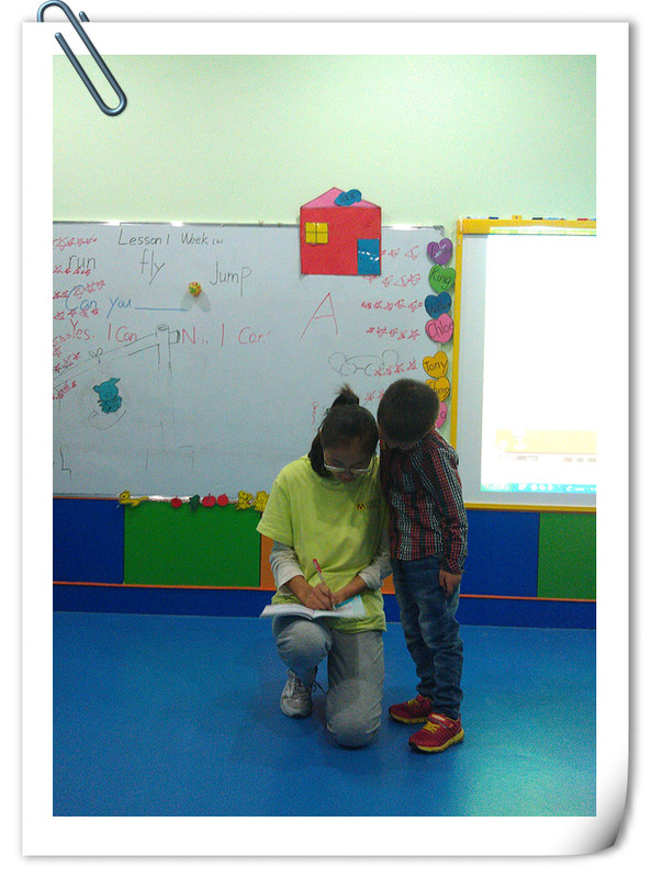 第一次英语课 在暑假里给点点报名参加了利玛窦英语的试听课,效果还不错,尤其是点点很喜欢那种上课的氛围,所以就给点点报名了,班级只有十五个人,小朋友的年龄都在五岁到六岁之间,男女也比较平衡,然后我们就去上第一次的英语课了。 老师要求小朋友提前十五分钟到教室,可以在教室里和老师同学有一个互动交流,熟悉环境的过程,所以下午三点半的课,我们在三点钟就到了,点点到了教室就和同学一起玩,第一次见面一点也不觉得陌生,熟悉环境的能力蛮强的,接着老师开始上课,家长就在休息室里面等小朋友。