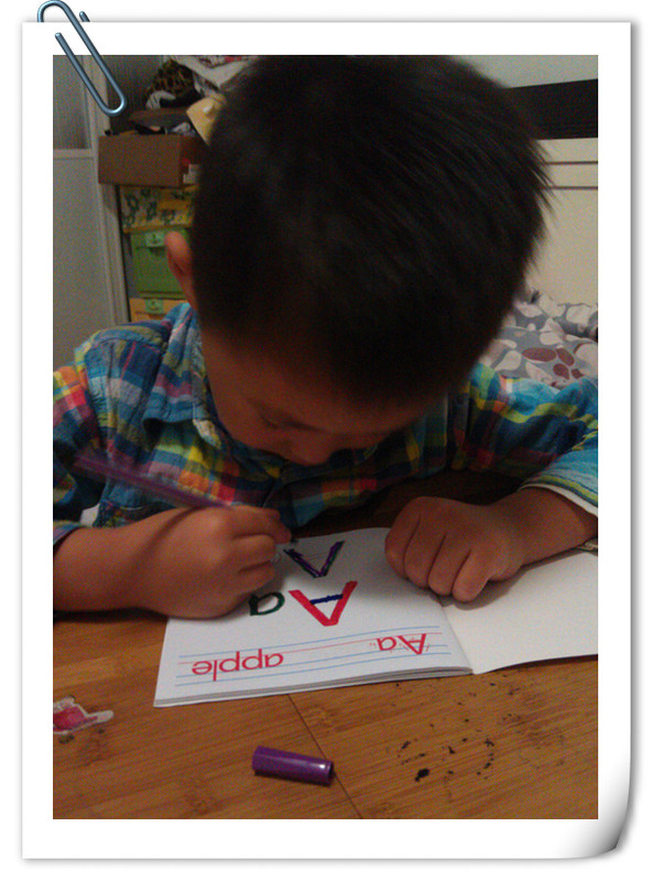晚上回到家,点点就开始做英语的家庭作业了,主要是给字母Aa,涂色,点点做得还是很认真的,复习的作业就是听录音跟读,读了三遍,还有预习的作业也做好了,这样我们每天要听英语二十分钟了,就算是磨磨耳朵吧,提高英语的听力和口语的能力,希望我们的英语学习能够坚持下去。