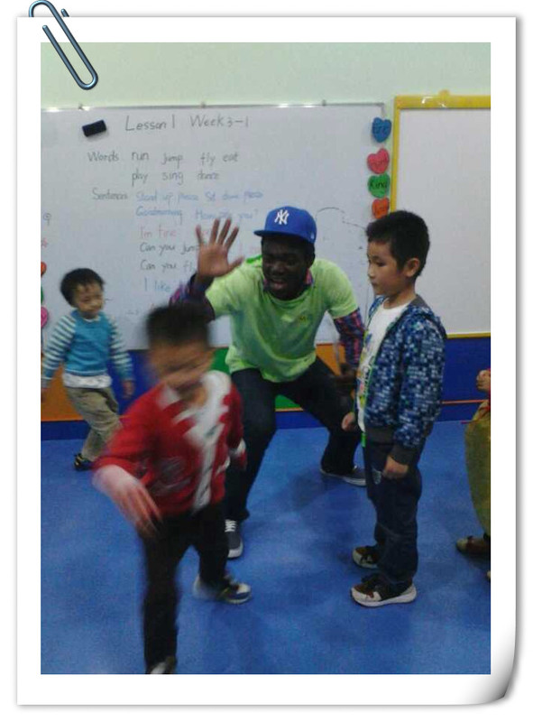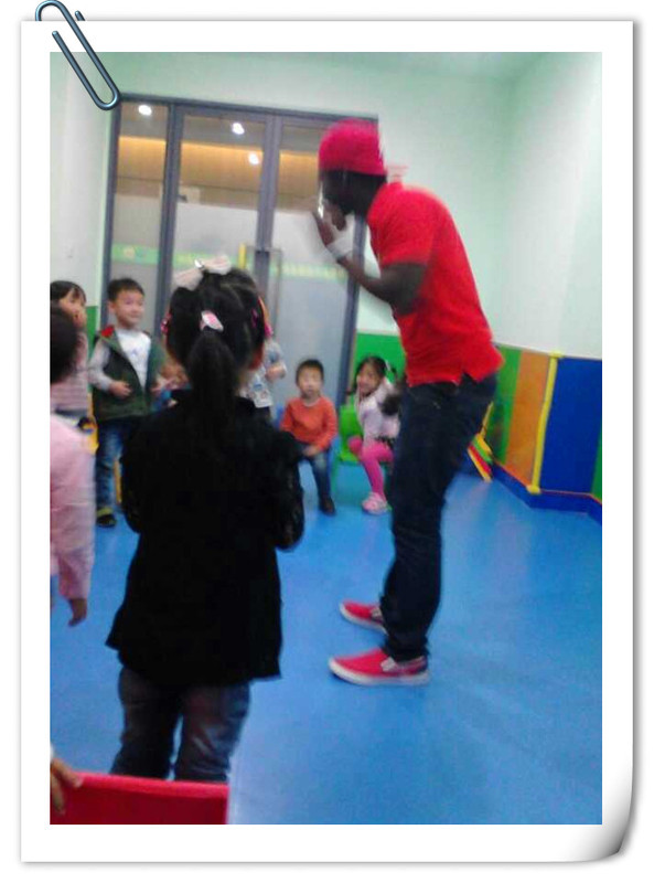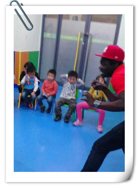英语外教课 点点每一次上英语课,总是有外教带着他们一起互动说英语的,听说这个外教是黑人,加拿大人,因为我们都没有见过黑人,就怕孩子会害怕,所以第一次外教课的时候,有些担心,点点的班主任老师说没关系的,选黑人外教就是因为视觉冲击力大,以后见到任何外国人都不会害怕的了。 小朋友们都在教室里面上课,外教老师 Roger很和蔼可亲,和小朋友们握手说Niceto meet you .说话声音很大,也很夸张,我们在另一个教室都可以听见老师和孩子们一起说英语的声音,而且还一起到教室外面活动。