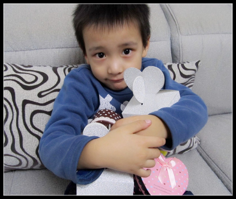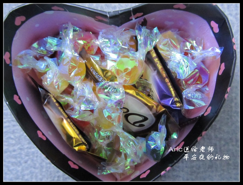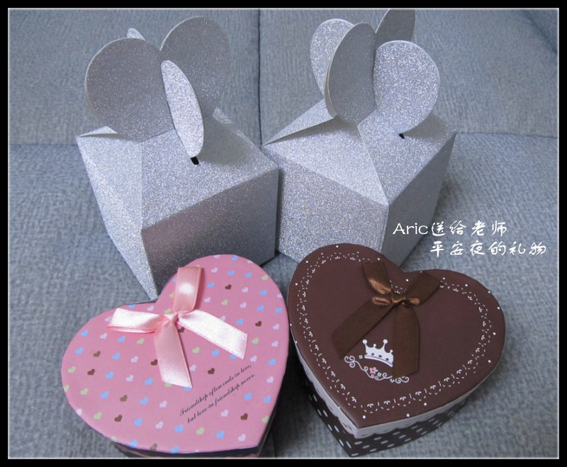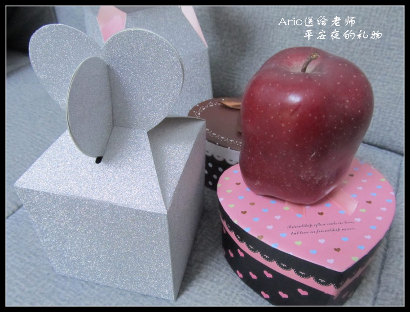 和Aric走在回家的路上,Aric说要送给老师礼物,我很好奇的问为什么?Aric说,因为马上就要圣诞节了,老师没有礼物收好可怜,而他自己却已经有预定好的礼物了。我想了想,这是Aric善良的表现,我同意了。我们没有立刻回家,到小学对过的玩具店和隔壁的商店逛了一圈,Aric给老师们挑了两个蛇果,我拿着旁边的苹果说不如换成苹果,Aric不同意,认为蛇果更漂亮一些。好吧,既然是小家伙自己的选择,我当然只能给予赞成和鼓励了。接着我们挑了两个一模一样银色亮晶晶的盒子装蛇果,Aric还选了两个心形的盒子来装糖果和巧克力。我很无奈,他什么时候能给我这么认真的选礼物啊,不得不承认,我吃醋了。