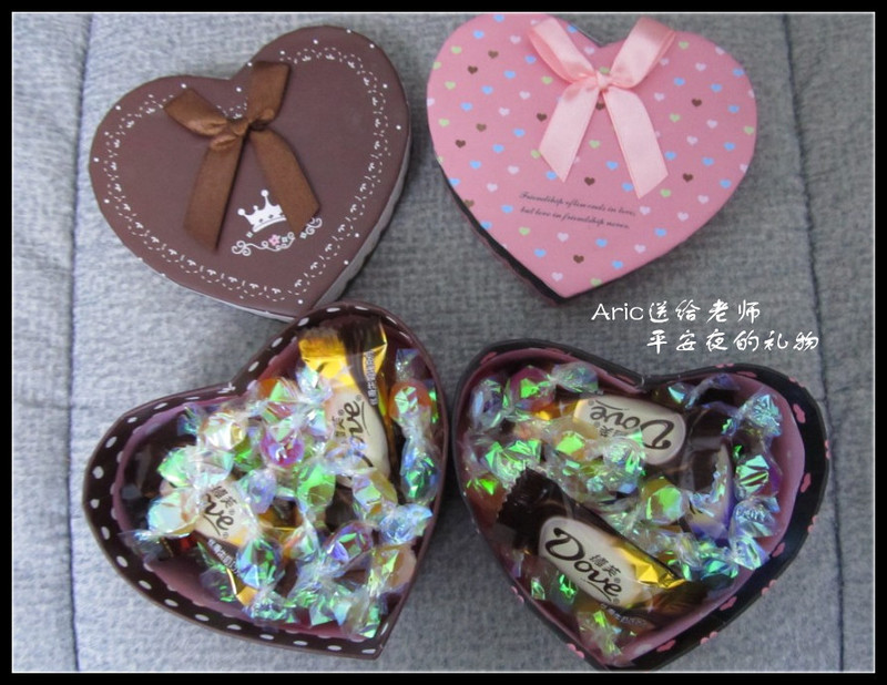 以前也有给这个新班级的老师送礼,可是老师说幼儿园有严格要求,不准收礼物,如果送礼物,这是要害他们被辞退的。我想,这次是孩子自己选的礼物,应该没有关系吧。这次Aric选的节日礼物,一共消费了80多元,其中还买了一盒德芙巧克力,不过只放了十几块在盒子了,剩下的被Aric藏了起来,打算没事的时候自己吃,糖块是按粒的,一粒1毛钱,商店可真赚钱啊!不过比起送礼,这还是划算很多的,嘻嘻。