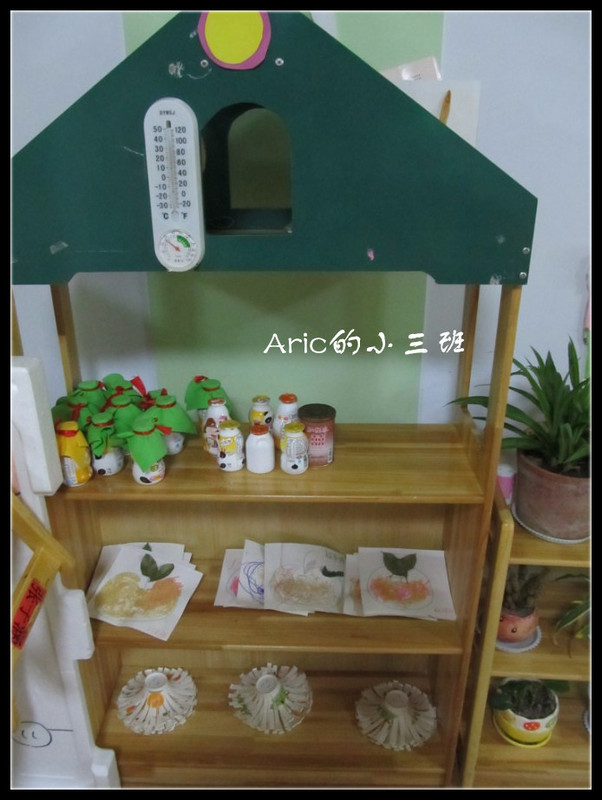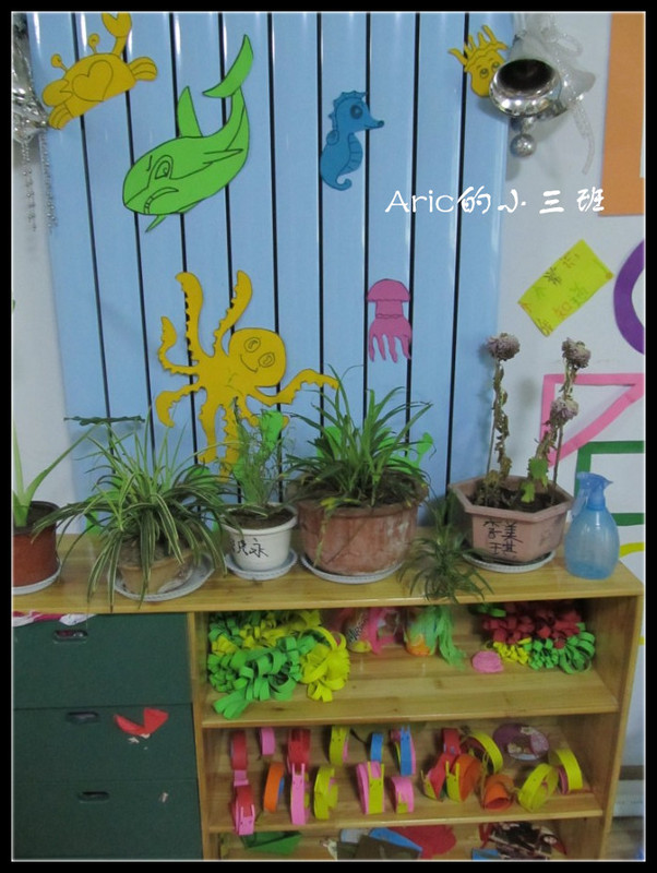 自然角搞得很不错,还有那个分门别类的药箱,这个教室比臣幼儿园的教室布置得要好