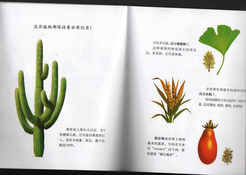 ![]() 阅读日期: 12月24日 参与人员:妈妈和宝宝 阅读绘本:《第一次发现丛书(奇妙的植物)》 绘本特色:法国国宝级儿童科普经典,内藏透明胶片增加趣味。适读年龄: 3-8岁 阅读心得: 世界上的每一块陆地上,都生长着各种各样的植物。——地球的各大洲名称和形状。我指着亚洲告诉孩子:中国就在亚洲,是个像大公鸡一样的形状。 翻过一页,咱们一起来看看,这几大洲上到底有哪些有意思的植物呢? 在北美洲 红杉可以活3000年。——在孩子的想像里,只是觉得好久好久啊!我比喻道:“一个人活一百年的话,那红杉就可以活30回。” 巨人柱:“仙人掌之王”它们把水分藏在茎部。——农博会上在“沙漠植物馆”中我们见到过。儿子指着住仙人掌里的小动物说:“好像一个人”。观察力很强啊。我都没发现。 红枫树:可以做枫糖,味道顶呱呱。——孩子听到糖,眼睛就发光。 蓝莓:紫色的果汁,可以做果酱,味道很好。——儿子说:“还可以做蓝莓面包”。大家还记得贝贝熊系列《母亲节的惊喜》吗? 刺果松是松树的一种。——松塔我们都很熟悉。 在南美洲 可可树:可可果可以做成你最喜欢吃的巧克力。——儿子兴奋地叫:“我也要种可可树。”我打击他:“可它长在南美洲,咱们这里没有。” 藤:像一根绳子……——像蛇一样啊! 铁兰的叶子像一个小碗,雨放在里面,一些小动物就在这里生宝宝。 玉米:玉米的花儿分雌性和雄性。玉米穗是雌性的花儿。雄性的花儿长在茎的最上面。 ——翻过透明胶片,看到植物的剖面图,将植物的内部更直观表现在我们眼前。吃了这么多年的玉米,我也是才知道。 土豆不是果实,也不是根,它是长在地下的块茎。——吃了这么多年的土豆我也不知道,一直以为土豆是根哩。 兰花长在别的植物上,有时候还长在树上。它靠雨水生长。——兰花分为地生兰和附生兰两类,中国的大多是地生兰。(偶也是百度才知道的。) 小个子的西红柿叫圣女果。我们平时都吃它了。 咖啡树结的果实是咖啡豆。——咖啡豆磨碎一冲就变成咖啡啦! 在非洲 百岁兰100年,才长两片叶子。 棉子外面毛可以用来纺线。 面包树:长在热稀树草原,到了不下雨的季节,它贮满水分的树干就变瘦了。——我拿骆驼的驼峰举了个例子,儿子一下就听懂了。面包树的果实像人头一样的大小,外表粗糙,里面塞满了像生面包一样的果肉。所以叫面包树。 在亚洲南部 猪笼草是一种食肉植物。——上面还有小盖子,可以在虫子进去后一盖,苍蝇啊蚊子什么的就飞不出来了,只能被吃掉了。 竹林:熊猫只吃竹子,开了花的竹子就死掉了。 大米:稻穗儿上挂着的就是一颗一颗的稻粒。——稻粒脱壳之后就是我们买的大米啦!。 银杏:古老的植物,不过种子很臭。——可以防止鸟啊什么的吃它的种子。 杏树:杏,大约春夏之间在东北就有卖的了。干果的地方还有卖杏仁的。 莲花:水面上开。——我们公园的水池里都有。有白色的、粉色的,嫩生生,大约在八月份就开得一大片一大片,很美。“小荷才露尖尖角,早有蜻蜓立上头”。 西伯利亚冷杉:一年都是绿色的,它的树上会结球果。它的木头可以用来盖房子。——妈妈小时候在山里见过噢! 在大洋洲 椰子树:椰子汁我们都喝过,儿子说很难喝。 桉树:能长100米高。叶子香香的,里面有桉树油。——有40层楼那么高。树袋熊只吃的桉树叶。 红树林:长在海水中的森林。它的根一部分在水底,一部分在水面上——儿子想起前面的落羽杉,就急着去翻到那一页指着说:“气生根”。 在大洋洲 木瓜树:木瓜的肚子里面全是木瓜种子。——儿子有一段时间很喜欢吃木瓜。 黄脂木:生长在澳大利亚的灌木丛中。——是不是木头都怕火?黄脂木就不怕,可以在火灾中幸存下来。 在北极区和南极洲,有可以入药的石松、亮丽的北极罂粟、只有20厘米高而且果实像小豆子可以吃的北极桑树。 世界纪录植物: 巨人树形仙人掌、古老的银杏树、人们吃得最多的水稻,大米的颜色还有黄的、棕的、紫的,多着呢!——我们见过白色、黑色的。别的颜色还没有见过。 世界上种得最多的西红柿。——英文名字“tomana”意思就是越长越多。 “第一次发现”,有的知识,我也是——第一次发现啊!不管怎么样,孩子很买帐,也很认真地听完啦!