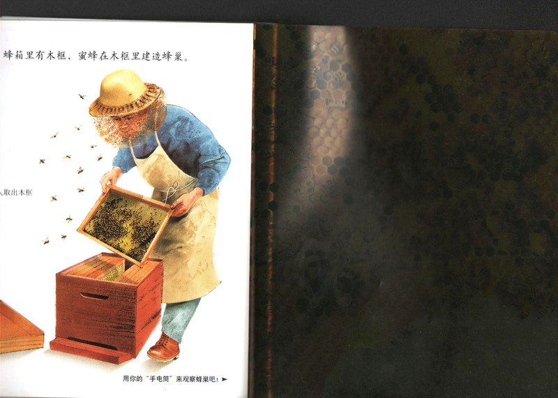 我们一起用“手电筒”来看蜂巢吧!蜂巢里住着工蜂、雄蜂、蜂后。 蜂卵孵化为成虫需要21天。——图中是蜜蜂孵化的全过程,刚开始只有一个小小的卵,然后变成白色像蚕蛹似的东西,再形成眼睛,最后变成蜜蜂爬出来啦。 最后用手电筒看蜜蜂那六边形的巢。——幸好他没问为什么蜜蜂的巢是六边形的,我也不知道啊! 再来就是高达几米的白蚁冢——(zhong)三声(肿)我查字典才认识这个字的,平时的时候用不上,还真就不知道它的读音。白蚁也是蚂蚁的一种。 白蚁用泥土混合唾液建成自己的家。——它们得有多少白蚁啊?得用多少唾液啊?旁边小孩儿和白蚁冢形成了对比。我们可以估量它有多高多大。 这种白蚁冢在许多热带国家可以看到。 白蚁冢里住着蚁后、蚁王、兵蚁、工蚁。 看看透明胶片上的白蚁冢内部结构吧!那些白色小点是白蚁裁培的真菌。——白蚁还会种“菜”啊?图中的蚁后好大啊,像小白蚁的房子一样大。 通过这次阅读,了解蚂蚁、蜜蜂、白蚁的科普知识,很有趣!我想男孩子对这些都比较感兴趣的吧!