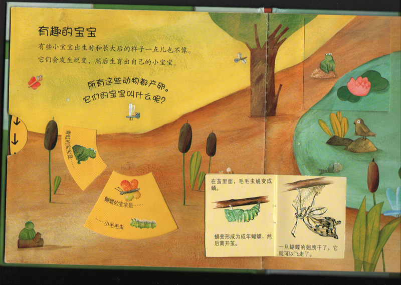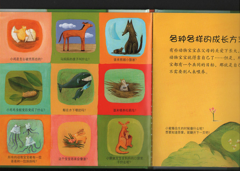 书中介绍了各种动物的小宝宝,分为:鸟类、爬行类、鱼类、昆虫、哺乳动物。