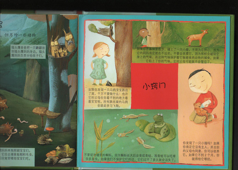 分别讲述了小狼皮克、马特和多尔:被保护得很好的儿狼崽 西帕:孤单的海龟宝宝 如何饲养面包虫?儿子看了这个标题就吵着要养虫子了。唉,在夏天,他爸爸钓鱼时挖的蚯蚓,他不让拿去钓鱼,要养着。一直养到冬天死去发臭,还不让我扔掉。现在又要养面包虫,难不成真去花鸟鱼市给他要两条回来? 我捂住书页,问他:“住在口袋里的小宝宝,除了袋鼠,还有谁?” 白天活动的动物宝宝和夜晚活动的动物宝宝:才发现,有个折页在和孩子读书的时候没有发现。 书的设计巧妙,独具匠心,孩子学起知识来和玩一样。真是做到了玩中学,学中玩。