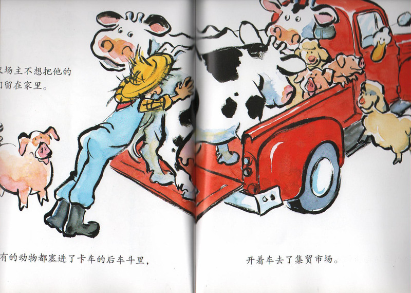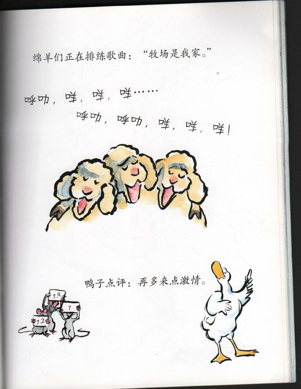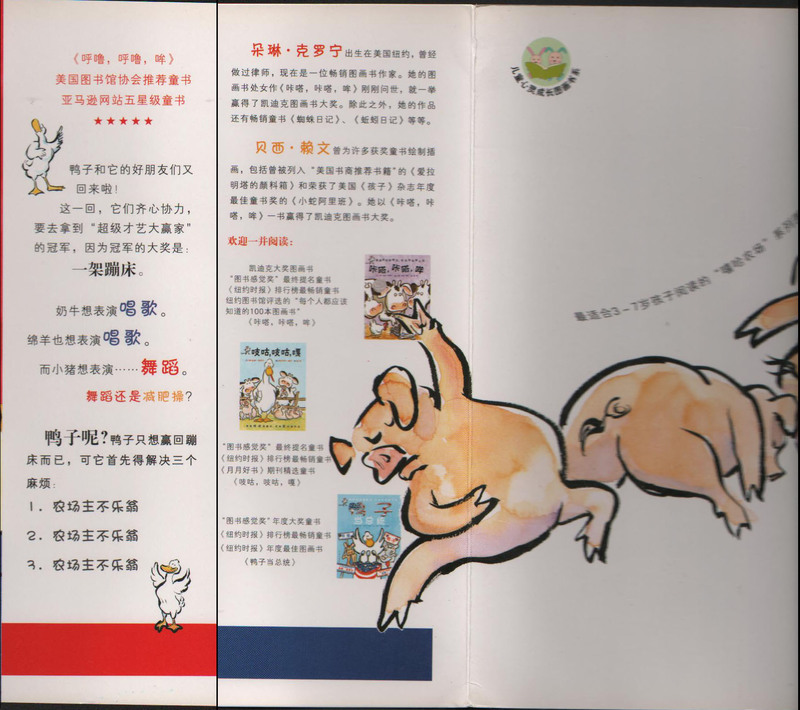 ![]() 阅读日期: 12月25日 参与人员: 妈妈和宝宝 阅读绘本: 《呼噜,呼噜,哞》 绘本特色: 有趣的象声词,让人捧腹大笑的嘻哈农场系列图画书! 适读年龄: 3-7岁 阅读心得: 《呼噜,呼噜,哞》故事内容简单而风趣,由内向外散发着作者的幽默.图画线条生动地勾勒出了嘻哈农场动物们发生的故事。《嘻哈农场系列》的其余三本分别是《咔嗒,咔嗒,咩》《吱咕,吱咕,嘎》《鸭子当总统》,有机会一定要见识见识。 ![]() “不乐翁”是嘻哈农场的农场主,他想让动物们老老实实地,所以天天盯着动物们。(好像我们家老板噢!也像是我们诸位家长呢!) 可是在不乐翁的眼皮底下,还是发生了他不知道的事情。鸭子在报纸上忽然看到了“超级才艺大赢家”的大广告,一等奖是“蹦床”,(更有趣的是下面的小字备注:请小心使用。大赛主办方不保证、不确定、不默认、不假定在蹦床使用中不发生任何意外。) 农场主不乐翁看到“每日邮报”上居然出现了一个方形的洞,就知道他的动物们又在调皮了。他更紧紧地盯着它们了,“他从上边盯着它们 ……”(像不像家长或老板在用各种方式盯着?) 在蹦床的引诱下,这群动物齐心一夜一夜地勤奋练习着才艺。 ![]() 奶牛表演歌曲,绵羊也表演歌曲,小猪表演……舞蹈。鸭子呢?鸭子只想着一等奖蹦床,可它得想办法去比赛!真是画得好玩极了。 比赛日到来了。鸭子急得走过来、又走过去。在它想办法的时候,小猪只是在打扮,奶牛也不在意地品茶。这可怎么办啊? 峰回路转,“不乐翁”要去赶集,他怕动物们捣鬼,将所有的动物都塞进了后车斗带去了集贸市场。大家看啊!不乐翁在使劲地塞,车上都放不下了。