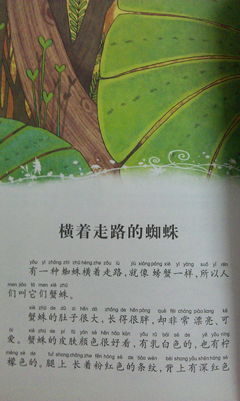 《横着走路的蜘蛛》 这个题目有趣,横着走路,那不跟螃蟹一样了么?哈哈,聪明,所以它的名字就叫蟹蛛,长得很胖,肚子很大,不过很可爱、很漂亮哦!蟹蛛就没条纹蛛能干了,不会织网,也不会捕猎,不过她却是很伟大的母亲哦,临死前咬断丝让孩子来到世界,而小蟹蛛却不知道谁是她的妈妈。