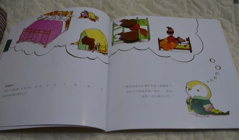 ![]() ![]() ![]() ![]() ![]() 我收到的是这本《不玩够,不能上床睡觉》说的是小猫头鹰睡觉的故事,和一般的故事的风格不一样的是,这套小书都是反着来的,不吃糖,不许吃蔬菜;不够脏,不能出去玩;不玩够,不能上床睡觉,作者从另外一个角度来描绘吃饭、睡觉和讲卫生这三件小宝宝容易让妈妈们头痛的事情,给妈妈们一个崭新的角度,规矩也是可以反着来制定的,而且达到的效果却是很好的。 ![]() ![]() ![]() 小猫头鹰和一般的小宝宝一样,喜欢玩,喜欢捉迷藏,喜欢一切小宝宝们都喜欢的游戏。 ![]() ![]() ![]() 每天晚上,小伙伴们都熟睡的时候,小猫头鹰却不可以,因为他是猫头鹰,按照猫头鹰的生活习惯,是不可以早睡的,这一点是小猫头鹰不喜欢的,也是大卫宝宝不能理解的。为什么呢?尽管妈妈解释了一通,大卫宝宝还是用很懵懂的眼神看着妈妈,也许对于小小的他这些优点深奥了,大一点了就慢慢的会知道了,这些就一笔带过吧。 ![]() ![]() ![]() 小小的大卫宝宝对于小猫头鹰的游戏很是感兴趣,不管是拿着小棍子在影子里游戏,还是在自己搭建的小房子里面玩耍,大卫宝宝都是羡慕不已的,想要小猫头鹰一样的小屋子,妈妈答应宝宝等明年大卫宝宝大一点的时候,就给大卫宝宝也搭建一个小小的屋子。 ![]() ![]() ![]() 终于到了规定可以睡觉的时候了,小猫头鹰还没有等爸爸妈妈和他道晚安,就已经在床上呼呼的熟睡了。 ![]() ![]() ![]() 大卫宝宝很喜欢这只可爱的小猫头鹰,他会小鸟这个,小鸟那个的说一些事情,在他小小的心目中,这个小鸟已经是他的朋友了。 对于反着来,反着定规矩,有很多成功的案例呢,之前就有一个朋友说他家宝宝在学电子琴,喜欢是喜欢的,就是比较贪玩,没有恒心,想起来就弹一弹,忘记了就好久都不弹,妈妈提醒了几次都没有什么效果的,于是妈妈也和这本书里面的小猫头鹰的爸爸妈妈一样,来了禁止这一招,就是平时不让孩子碰琴,只有孩子表现好,或者是周末的时间才能孩子弹上1小时或者半小时,要提前申请的,这下可好了,孩子弹琴的热情一下子上来了,几乎每天都会要求妈妈弹上超过一小时的时间。这和这本书的思想是不是异曲同工啊。 育儿路上,我们会遇到很多的问题,不过我们有很多可以借鉴的地方,这本书的规矩反着来,就是很不错的借鉴呢,而且有时候的效果可能比激励更加的有效果,因为只有被限制的才是宝贵的,不光是小小的宝宝这样认为,有时候大人不也是这样的思维和逻辑吗? ![]() ![]()