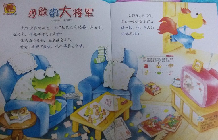 最近宝又迷上了红袋鼠的书,喜欢每天讲完一个故事再玩后面的迷宫小游戏。这样的书很不错,既有故事可以讲,还有益智游戏可以玩。 火帽子和跳跳蛙约了红袋鼠来玩耍,但红袋鼠还没来,在等待红袋鼠的时间里,两个人用看书、画画、看电视吃水果来打发时间。电视里正在唱京剧,于是两个人玩起了演戏的游戏。火帽子当了守门大将军,跳跳蛙当关羽,想要打败守门大将军冲回家去。两个人玩得正欢的时候,红袋鼠来敲门了,因为电视声音太大,两人玩得太专心,都没听见敲门声。红袋鼠一推门,门把手撞着了火帽子的头,火帽子疼得大叫,还说没关系,他是守门的大将军。红袋鼠叫回了鸡妈妈,帮火帽子擦了药,妈妈交待红袋鼠别往门后站,这样很危险。 在现实生活中,像故事中被门碰伤或夹伤的事情发生得还比较多,因为门后面是捉迷藏躲猫猫的好地儿,而有些父母也会把东西放在门后引起孩子的好奇心。我家两宝曾经也被碰到过,故事一讲完,大宝就记起来他曾经也被门夹伤过。我告诉宝,尽量不要在门后面玩,要不然就容易像火帽子一样被碰一个大包,这样会很痛而且很危险。也不要像红帽子和跳跳蛙一样在家里打打闹闹,这样不仅自己容易受伤,还会不小心把家里的东西打坏。 本作品未经作者许可不得转载,转载请征求作者意见。擅自转载使用,将保留追究其法律责任的权利! 个性签名