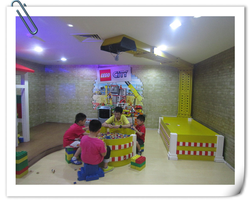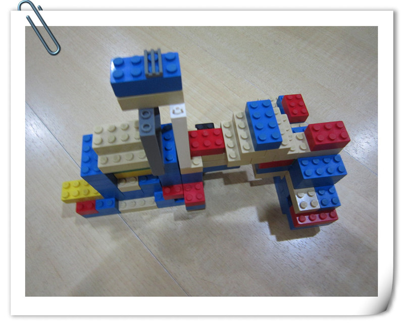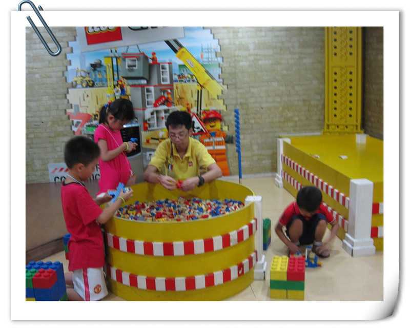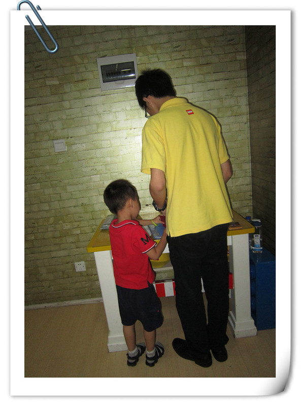点点先看里面的老师怎么样搭建,然后就自己搭建了,我们再外面的玻璃窗里面看得还是比较清楚得,点点搭得也比较快,时不时去问老师拿零件,过了二十分钟,都已经搭好了,我就进去给点点拍照。