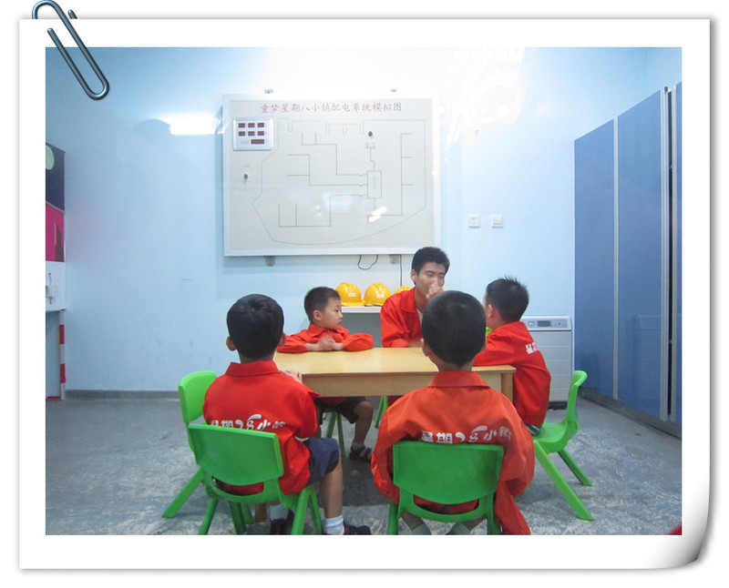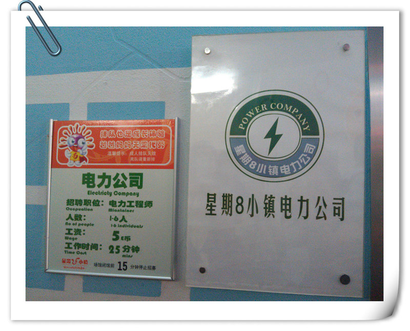 在点点进去以后,就穿上工作服,然后我在外面看介绍,门口有介绍这个职业体验的的种类,工资,时间等,而这个电力工程师还帮助我们认识电是怎么来的,发电的方式很多,有水力发电,核发电,火力发电,风力发电,太阳能发电等。后来点点在去海边看见白色的风车,就说是风力发电,就是从这一次职业体验学来的。