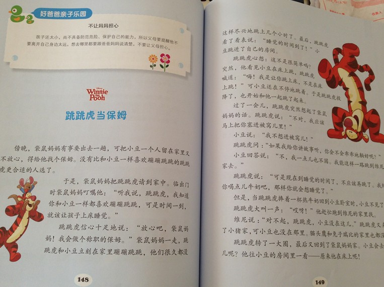 ![]() 阅读时间: 1.2 阅读成员: 妈妈 宝贝 外甥 适合年龄: 3岁以上 故事特点: 保护好自己就是最爱爸爸妈妈的一种表现,要懂得去什么地方都要告诉父母. 阅读心得: 今天讲故事前我没有让孩子们选故事的题目,而是做了一个小游戏,因为爸爸给我讲故事里的故事都很多,孩子们很多的汉字都不认识,那就用数字来代替多好,让儿子随便说出自己的想要的一个数字,从9开始到200都可以的.两个孩子开始想啊想,弟弟先说了一个55,于是我就翻到了这一页开始给他们讲,接下来该儿子说了,儿子说151,翻开一看是故事的结尾部分,那就是应该往前翻到故事的开头是什么故事就讲什么了.故事的名字就叫<跳跳虎当保姆>. 傍晚的时候袋鼠妈妈要出门办事,可把小袋鼠小豆一个人留在家里可不放心,得找一个保姆看着小豆才好,于是就想到了跳跳虎,因为他们都特别喜欢跳呀,于是跳跳虎就当起了小豆的临时保姆了.临走的时候袋鼠妈妈嘱咐一定要按时上床睡觉才可以的,跳跳虎信心十足的答应了.可到了睡觉时间小豆还是不停的跳来跳去的,一点都不停跳跳虎的话,跳跳虎开始想办法了,讲好听的故事,小豆不干,那喝一杯牛奶可以帮助小豆睡觉呀.就在跳跳虎去倒牛奶的功夫,小豆不见了.这可把跳跳虎给着急坏了,开始四处寻找起来.哈哈!最后知道在哪里找到小豆的吗?原来小豆就在家里呢.那它刚才去什么地方了呢?原来钻到床底下去了.跳跳虎不知道还以为他跑出去玩了呢. 故事不像绘本那样会有很多的图片来让孩子观察,都是文字故事,但同样好听,故事中仅有的三个插图都让孩子可以感受到跳跳虎和小豆玩的非常的开心,也让孩子明白一个道理无论做什么事情都应该打声招呼,避免意外的发生.尤其是我们现在的社会更应该加强孩子安全方面的教育. 本作品未经作者许可不得转载,转载请征求作者意见。擅自转载使用,将保留追究其法律责任的权利! 个性签名