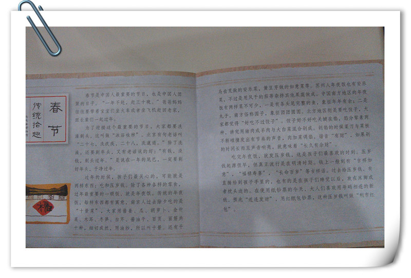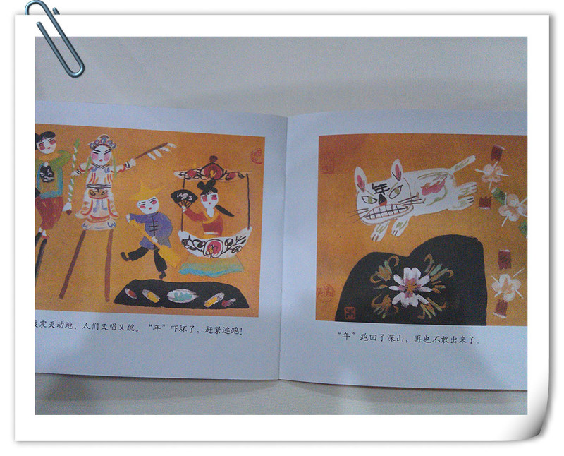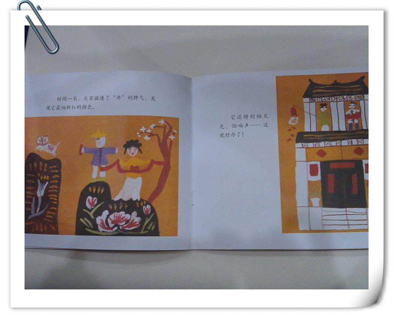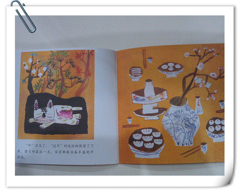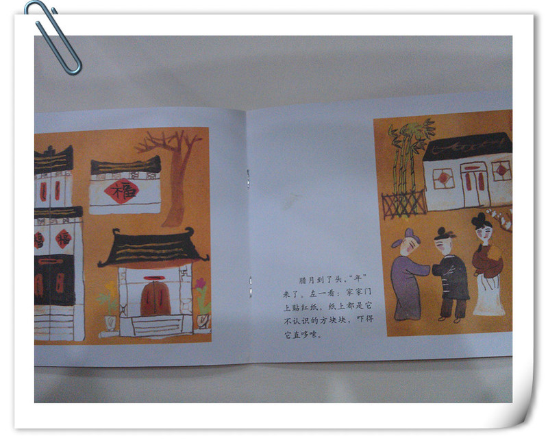 ![]() 今天点点带回来一张调查表,主要就是要小朋友回家和爸爸妈妈一起调查一下新年是怎么样一回事,老师说可以上网查,或者问问家里的老人,然后完成一张调查表,点点说新年的来历家里有一本书的,让妈妈找出来一起看,里面有很多关于新年的知识了,然后我们就一起看绘本了解春节的来历。 ![]() 故事讲了很久很久以前有一个凶猛的怪兽叫做年,年伤了很多小动物,还上伤了人,天神惩罚年锁在深山,不可以出来,一年只能出来一次,老百姓整天提心吊胆,到了腊月的最后一天,年出来了它还是很凶猛,然后大家想了一个办法。 ![]() 每到腊月,人们赶紧做好准备,最后大家发现年很怕红色,还特别怕火,怕响声,然后人们就在门上铁春联,贴福字,年来了,看见红色的方块块,还听见了劈劈啪啪的鞭炮声,很害怕,躲进了深山,再也不敢出来了。 ![]() 最后,年不见了,过年的风俗却保留下来了,腊月的最后一天,全家团聚吃年夜饭,大年初一,家家贴春联,互相拜年,放花炮。 ![]() 在书的最后面还有一个春节传统识趣,我们在这里知道了我们每年年夜饭吃的菜都有说法呢,完整的鱼象征年年有余,我们吃的丸子象征团团圆圆,饺子里面的馅有菜有肉,谐音就是有财,如果剁的馅时间长,声音响亮,象征着"长久有余财"。 ![]() 吃完年夜饭,我们还要发压岁钱,也就是红包,用连号的钞票,意味着连连发财,本来这些我们都不知道的,现在看过书以后就明白为什么这样做了。 ![]() 看完绘本,我们要完成调查表上面的四个问题了,也算是对这本故事的延伸吧: 妈妈:点点,新年的习俗有哪些呢? 点点:吃年夜饭,拿压岁钱。(看来小朋友过年就是喜欢吃和拿压岁钱,我小时候也这样。) 妈妈:我也喜欢拿压岁钱。还有贴春联,放鞭炮呢,你不是最喜欢放鞭炮吗? 点点:妈妈已经长大了,不能拿压岁钱了。 妈妈:好吧,让爸爸给妈妈包一些。那么拿了红包你准备做什么呢? 点点:我要买一些书,还要出去玩。(还知道买一些有用的东西,也不忘记玩。) 妈妈:你的新年愿望是什么啊? 点点:我的新年愿望是天天开心。 妈妈:新年的时候要向谁拜年啊,说些什么祝福话? 点点:我给爸爸妈妈,爷爷奶奶,外公外婆拜年。祝爸爸妈妈天天开心,爷爷奶奶长命百岁,外公外婆吉祥如意。(点点还真会说话啊,都说的很贴切。) ![]() 看完书,写完调查表,本来想着晚上给调查表拍个照片的,可是晚上到家,点点说表格已经交掉了,就没有拍照,不过幼儿园放假以后还会发下来的。 本作品未经作者许可不得转载,转载请征求作者意见。擅自转载使用,将保留追究其法律责任的权利!