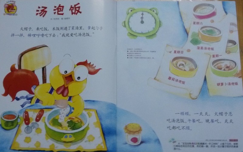 火帽子吃饭爱吃汤泡饭,把饭倒进菜汤里,拿起勺子拌拌囫囵吞下去,一天三餐都吃汤泡饭。火帽子找到朋友小猫和小狗,想请客吃饭,遭到朋友的拒绝,都不喜欢吃他的汤泡饭。红袋鼠和跳跳蛙也同样拒绝吃火帽子的汤泡饭,红袋鼠说,汤泡饭,囫囵吞,不但尝不出滋味,还给肠胃添负担。跳跳蛙说,汤泡饭,囫囵咽,营养吸收少,个子长得慢。但火帽子不听朋友劝,依然天天吃汤泡饭,最后生病看医生了,医生说体质差,要多锻炼,吃饭要细嚼慢咽,不能再吃汤泡饭。这次火帽子听了医生的话,再也不吃汤泡饭了。 宝听完这个故事,马上说,妈妈,我没有吃汤泡饭,我会长很高。确实,在汤泡饭这方面,我很少让宝这样吃,也知道这样吃多了不好。但小时候宝外婆没让宝少吃,还一直说这样吃好,有营养。还好宝没吃出什么毛病,抵抗力也还行。但宝吃饭也有个毛病,就是吃饭的过程中喜欢喝水,严重的时候就是一口饭一口水,我告诉宝这样边吃饭边喝水也不好,也会像火帽子一样容易生病。以后吃饭要尽量在饭前吃,千万不要在吃饭的时候喝水。 本作品未经作者许可不得转载,转载请征求作者意见。擅自转载使用,将保留追究其法律责任的权利! 个性签名