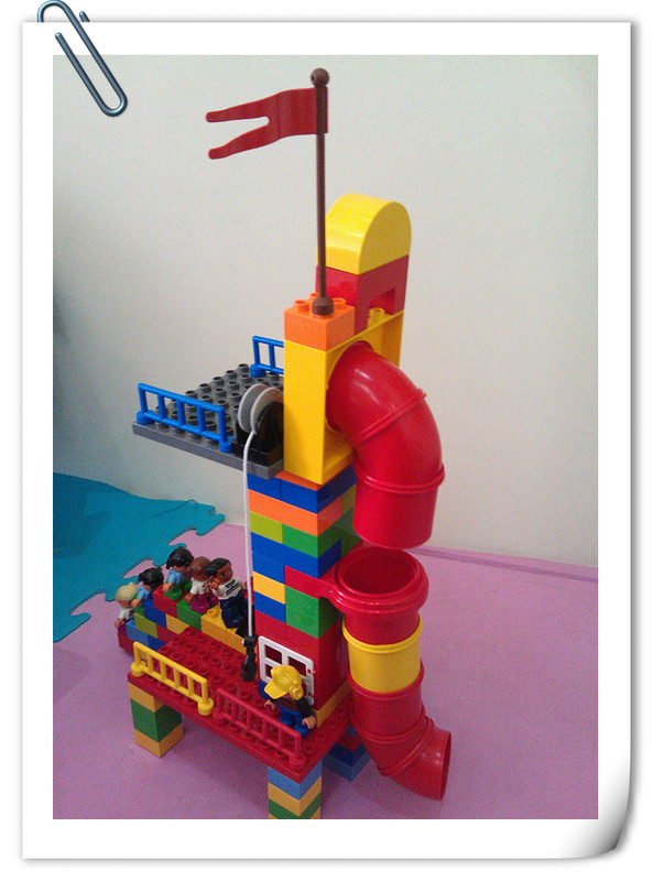 快要下课了,点点就让妈妈进去拍照,点点向妈妈介绍这是他搭的双用滑滑梯。这个滑滑梯有很多小朋友在排队轮流滑,滑滑梯是双用的,可以坐电梯上去,还可以爬楼梯上去,点点指着自己搭的积木,指给妈妈看,哪里是坐电梯上去的,然后妈妈给点点的滑滑梯拍照。