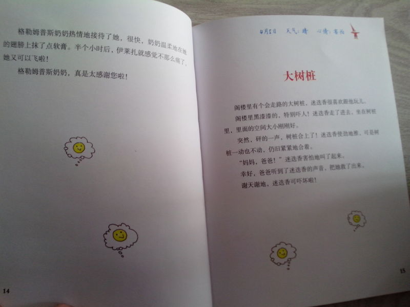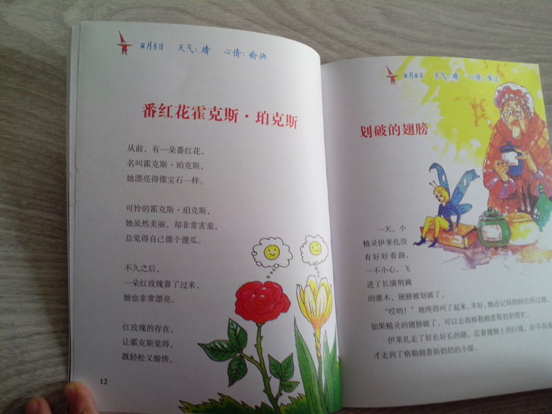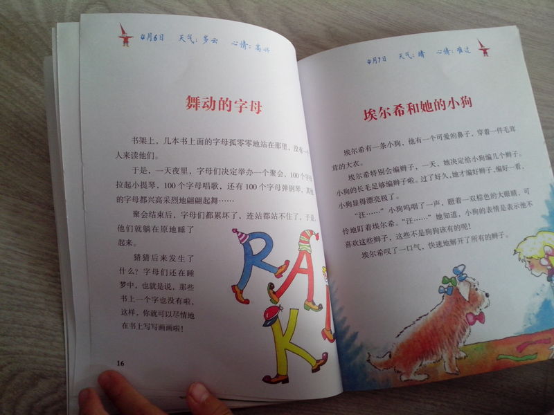 申请这本《童年的缤纷日记》试读的时候正好赶上果学校老师正在教孩子们怎样写日记,而且布置了作业让孩子们每天写一篇日记,正好碰上有这种日记的试读,当时想可以帮助果更好地认识日记这种写作形式及方式,没想到还真中了这本试读。