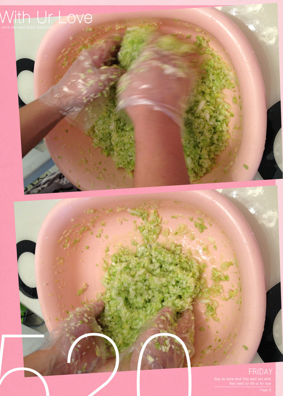 中午吃过午饭,桐桐午休,我和老公就忙乎开来。我负责切碎各种原料,他负责把包菜挤出水来(不得不说,这次饺子的成功,老公的这个“挤水”工作做得超棒!馅料里的包菜都没有那么多水分,让我们的饺子包起来很容易,不容易破,而且能够跟肉等其他原料融合很好。)