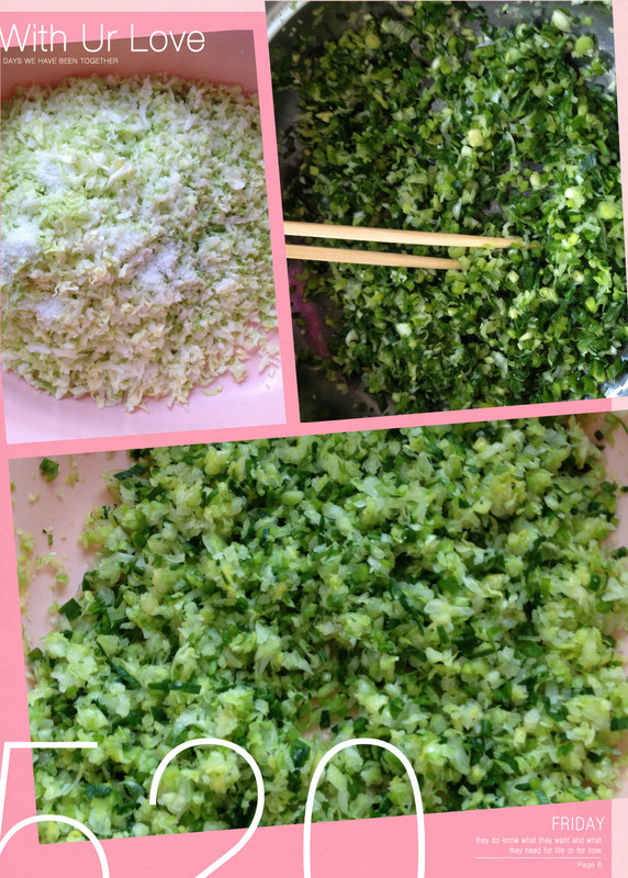 接下来把买来的葱切碎了,其实切容易,不容易的还是去水工作,当然还是少不了老公的帮忙!他说:已经使出了吃奶的力气来用双手挤压这两样青菜中的水分。当然了,在挤水之前,不忘了加入一些盐,能起到控水作用。葱末和包菜末一起混合再一次,素食菜馅儿就完成了。
