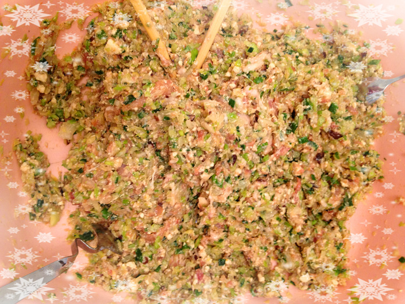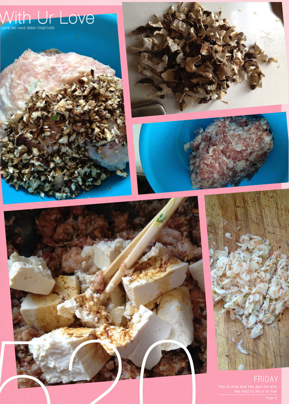 紧接着就开始时荤菜馅儿:剁碎干蘑菇、虾米、五花肉,混合后最后加入买来的一大个豆腐,然后再加入两个鸡蛋。