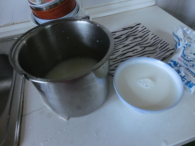 ![]() 家里订了牛奶结果昨天忘了喝,放在家里成灾了~~可是一次性喝掉又喝不完,怎么办呢?干脆做成酸奶吧~~因为前段时间在杂志上看到即使没用酸奶机也是可以在家里制作酸奶滴~~所以超级想尝试一下。 ![]() 正好昨天去了趟超市,买回来了2盒酸奶。看了超市里卖的酸奶有很多食品添加剂,比如:安赛蜜,苯甲酸钠,苯丙酸铵......早就有自己做酸奶的念头了。只因为以前一直认为在家做酸奶必须用酸奶机,却又感觉那东西不实用就一直没有买。所以一直都没有试过做酸奶,今天是第一次尝试,希望我能成功哦!~~~ ![]() 制作酸奶的原理很简单,就是把牛奶加温煮沸,然后降温到50°,再按照1:10的比例倒入酸奶,然后依据自己的口味加上糖放进电饭锅里按“保温”开关放上几个小时就可以了。 因为制作时间是上午10点钟,要做米饭了。于是就改成了用焖锅。是的,这一次我想用焖锅做做试试看。 ![]() 我把牛奶都煮沸倒进了焖锅。 然后等它降温感觉比较凉了以后就加进了2盒的酸奶和些许的白砂糖。 紧接着拿来打蛋器将溶液搅拌均匀 盖上了锅盖,装进焖锅,就放着不管它了~~ ![]() 等到下午的时候我打开焖锅看了一下,发现第一次做的酸奶做稀了。不过喝起来发现味道确实很正。(之前我在街上卖鲜奶的地方有买自制酸奶的,这次做的味道和买的差不多)不知道是不是,4袋牛奶加2小盒酸奶,酸奶引子有一点儿少了?或者是焖锅无法低温保温。下次多加一些酸奶引子,然后老老实实地用电饭锅再试一下看看。