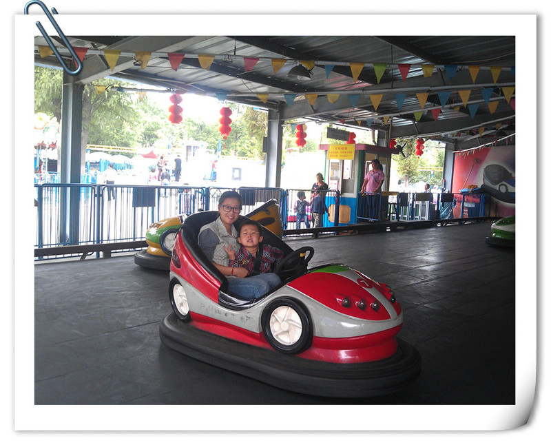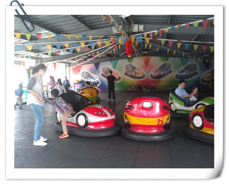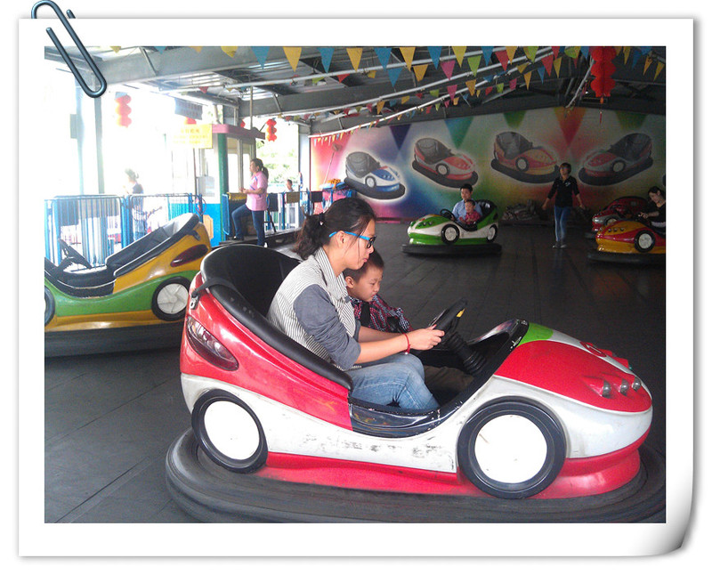 阿姨似乎也不大会开啊,两人的车子被别人夹在中间了,然后好不容易出来了,又和旁边的车碰在一起了,碰碰车就在这样互相撞击中撞出开心,撞出水平,有些人碰到了就会后退,而点点还是往前开,根本开不过去,所以碰碰车还是需要技巧的。