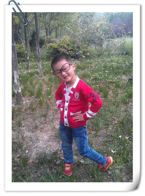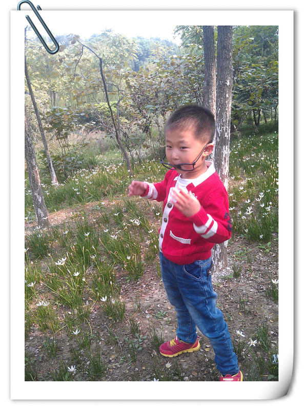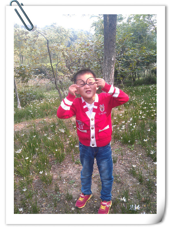 在拍外景写真的时候,摄影师叔叔带点点去了一片草地,草地上有很多野花,叔叔让点点闻一闻花的香味,点点故意采花扔叔叔,还故意不配合拍照,闭着眼睛,还做怪动作,戴着眼镜,就把眼镜总是往下拉,含在嘴里,真可笑。我说就拍那样的怪动作,让他自己看看好不好看,然后点点才安稳一会儿。