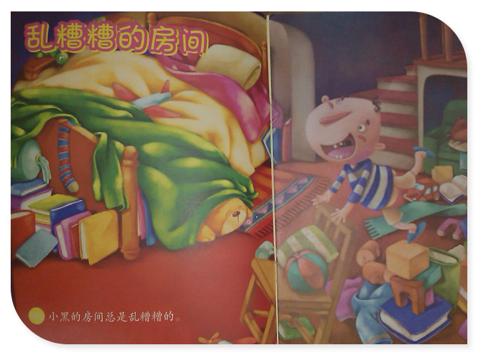 这个故事的文字非常的简单,一个叫小黑的宝贝个性造型非常可爱,很吸引孩子的眼球,头顶好像只有几根波浪卷发,圆溜溜的眼睛,细长的像胡萝卜一样的鼻子让孩子看起来都觉得印象深刻的。看画面第一页,床上乱糟糟,袜子、被子胡乱的放着,地上也是糟糟的,积木扔了一地,电动汽车在地板上呼呼的跑来跑去,毛绒小熊从床下露出一只胳膊,图书躺到了书桌下。就是这样一片狼藉中,小黑还推着椅子疯玩呢。妈妈推门进来生气的说道:“好好把房间收拾干净”,小黑却问:“我从哪儿开始收拾呢?”“从哪儿都可以”妈妈说。小黑不知道应该从哪儿开始收拾,可是他最喜欢看书了,干脆躺在乱糟糟的东西上看起书来。突然小黑大哭起来,原来他最喜欢的那本书找不到了,妈妈说:“一定是被你那乱糟糟的东西埋起来了”。于是小黑开始收拾房间了,不一会房间就被收拾的整整齐齐。小黑也找到了最喜欢的那本书了,妈妈也高兴的说:“你的房间不在乱糟糟的了。” 本作品未经作者许可不得转载,转载请征求作者意见。擅自转载使用,将保留追究其法律责任的权利! 评分记录