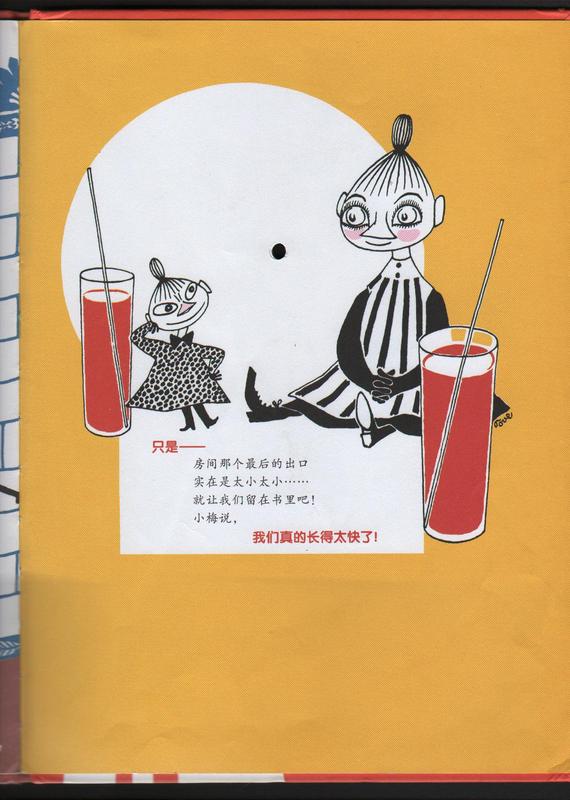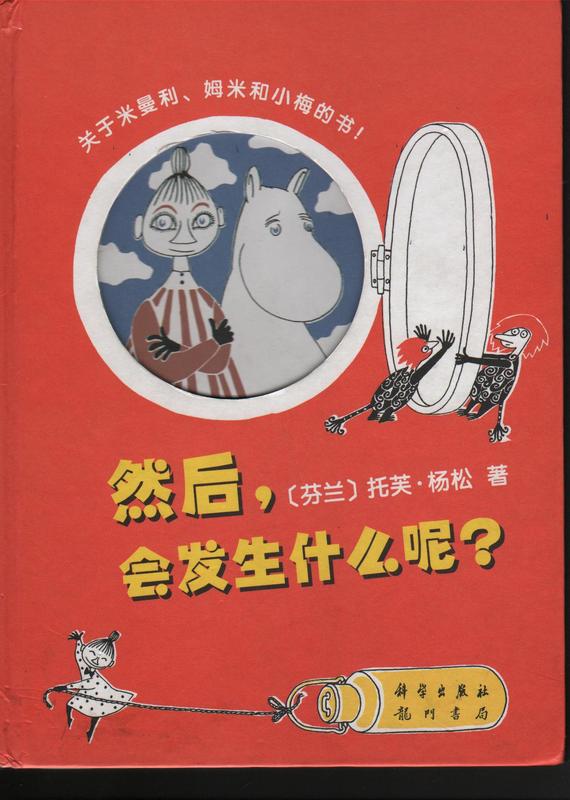 那么,《然后,会发生什么呢?》一段奇幻之旅开始了。森林里,小姆米提着牛奶桶往家里走,路的尽头是四分之一红日偷偷露出脸庞。森林里却看得出并不平静,几只眼睛在偷窥……还有几只我们说不出名字的动物。 小姆米安慰哭泣的米曼利,她们一起爬进管子找她的妹妹小梅。紫色的、神态各异的鱼和紫色头发、像个女巫似的洛斯卡在管子的另一边,米曼利和小姆米在满地巨石的山洞中没有找到小梅也没有找到回家的路。“对,到有太阳的地方去!然后,会发生什么呢?”巨人海姆的吸尘器吸走了小姆米、牛奶桶、米曼利(蜘蛛和它的网、鱼刺)。小梅救出了米曼利和小姆米,米曼利居然说:嗨,小梅,真是太好了,我们终于救了你!(也不知道是谁救了谁)长着老鼠脸的维利雯卡,画上还有鸟一样的怪物、手指一样的哈蒂瓦蒂的家像个诡异的人脸(请原谅我的想像力)。终于一切都过去——“黑夜终将离去,白天将带来祥和、温暖。然后,会发生什么呢?” ……牛奶变成了酸奶!——“没关系,我们喝果子汁也不错!!!” 封面大圆窗变成了一个小小的圆洞——小梅说:“我们真的长得太快了!”