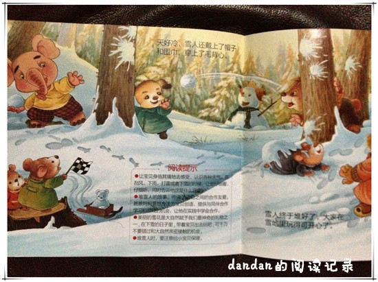 ![]() 阅读日期:1月8日 参与人员:爸爸和宝宝 阅读绘本:《小小猫系列:堆雪人》 绘本特色:认识雪。 阅读心得: 三天的帝都之旅结束了,去之前我就挑了这本雪人的书给他们,就是想能够有好运气碰上北京的雪,哈哈。 可惜木有等到北京下雪,倒是见到了北京的蓝天白云。 今天依旧是父子俩的读书记录。 ![]() 《堆雪人》的故事说的是冬天下雪的时候,小小猫期待的堆雪人活动终于有希望成行了~~~ 妈妈说要等雪下的厚一些才能去堆雪人,于是小小猫在家等待了一晚。 第二天一早,小小猫冲出门踏着厚厚的积雪去堆雪人咯。 妈妈叮嘱小小猫要穿的暖和一些。 小小猫滚了一个大雪球,推不动了,于是小狗来帮忙,它们堆啊堆,雪球又推不动了,于是找来小熊和大象来帮忙。 几个小伙伴一起,堆了一个大雪人,它们给雪人安上眼睛、鼻子、嘴巴,和手。 雪人堆好啦,小伙伴们很开心,在雪地里打雪仗玩儿。 估计看完这个故事,小朋友们都会很希望能够去雪地里真实地堆一堆雪人吧! 本作品未经作者许可不得转载,转载请征求作者意见。擅自转载使用,将保留追究其法律责任的权利! 评分记录