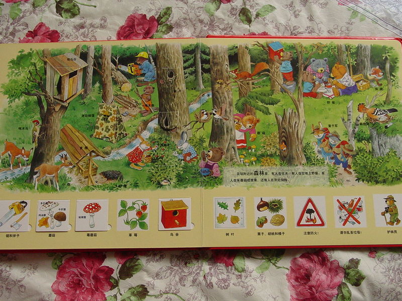 托尼·沃尔沃翻翻书,是享誉世界的意大利的著名画家托尼·沃尔沃创作的!书中的画风唯美可爱,作品充满了想象力和浓浓的童心童趣!,他创作的多部图画书畅销欧美,深受全世界的小朋友们和爸爸妈妈们的喜爱! 这套翻翻书一共有五本分别是《农场》《城市》《森林》《海洋》《童话》现在给大家介绍的这一本是《农场》! 虽然这本书一共只有7页,但是里面有50张以上的小翻页!非常的有趣! 看,我们今天来到了这个可爱的农场,一大早,大家都起得很早,大家都很忙,有的修理屋顶,有的收集蜂蜜!有的在遛马,还有的在吃早餐! 翻开狗舍,哈哈,一只可爱的小狗在狗舍里面正准备出门呢!可是被关在里面,狗狗没有自由很伤心!儿通长里面装的是粮食哦!知道狐狸这张卡片后面藏着什么吗?哈哈,原来是几只大公鸡!原来狐狸心里惦记着公鸡呢! 我们一起来到了马厩,好多帅气的马儿啊!马儿需要大家的照顾,需要洗澡,需要给他喂美味的甘草!铁匠在给马儿钉掌!马儿要训练跳的很高来跨越障碍!这位优秀的赛马骑士还得过漂亮的奖杯呢!柴火棚里面还藏着一只可爱的小猫咪哦! 逛完马厩我们来到了牛棚!挤奶的时间到了!牛奶车已经在一旁等候着呢!绵羊要剪羊毛哦!我们的工作还真的很多哦!屋顶还要修理!牛奶车从制冷罐里面被管子传送到了牛奶罐!猪阿姨在用牛奶做黄油!小老鼠想偷吃黄油哦!哈哈屋顶上面还有小燕子哦!真可爱! 我们来到了田里,麦子已经收割完了!准备栽种下一茬的作物菜园里面,瓜果蔬菜,琳琅满目!稻田里,还徐璈灌溉,温室里面,花苗茁壮成长!鲜花争奇斗艳!小老鼠骑车太着急,撞到了温室的玻璃上!玻璃被打碎了!把花苗砸歪了! 菜园里,小鼹鼠藏在地下,说自己在松土! 想吃水果吗?那就一起跟我来果园吧!各种水果都成熟了!果农们正忙着采摘!这里的果农都是动物,狮子,鸭子,鹅,大象,大家都在努力工作,真是一番有趣的景象!好大的苹果啊,翻看一看,小心,后面有一只毛毛虫!真是太有趣了! 农场附近有一片森林!这里动物们也很忙碌,有的在伐木,有的在采摘蘑菇和浆果!有的在到处探险,一副其乐融融的场景!哈哈,探险的是一队童子军!河狸砍了一大堆的木柴!熊是护林员!那保护这片森林! 今天阳阳放假,阳阳一边翻看这本书,一边看图给我说里面的内容,我就来打字,这算是阳的一篇报告吧!! 本作品未经作者许可不得转载,转载请征求作者意见。擅自转载使用,将保留追究其法律责任的权利!