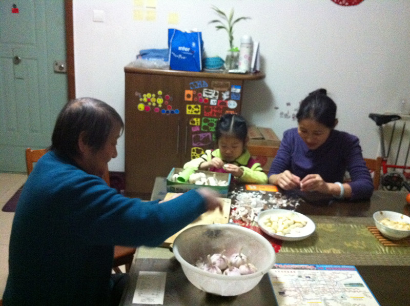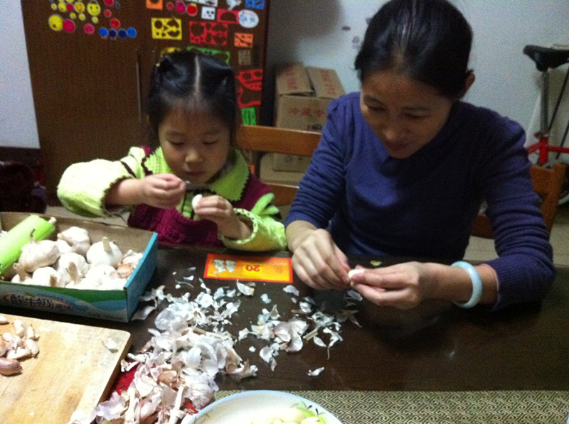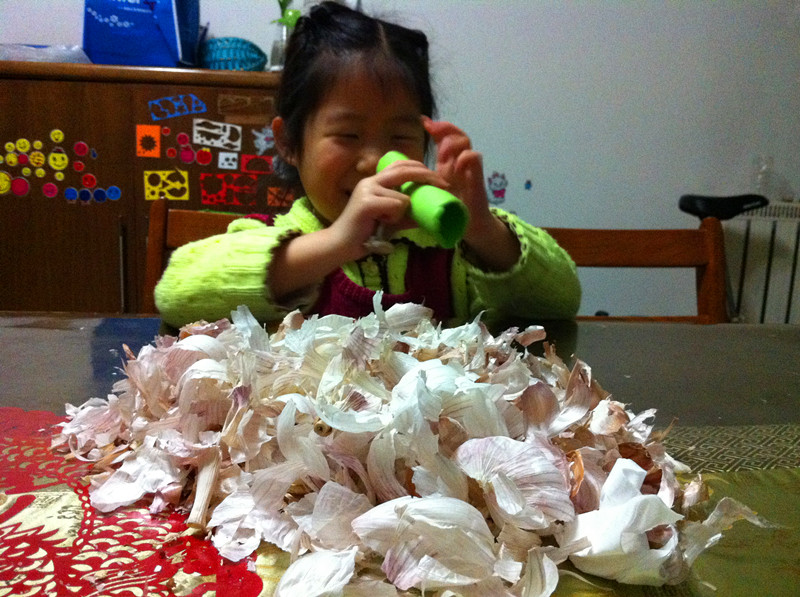 昨天是腊八节,是喝腊八粥、腌制腊八蒜的日子。在我们老家其实是不过这个节的,来到北京之后,才知道原来腊八节还是一个正经节日呢,据说腊八节还要吃饺子。俺不喜欢吃饺子,不过对这腊八蒜还真是情有独钟。平日我是不吃蒜的,嫌味大。自从多年前和前同事在一家东北饭馆吃过饭馆自制的腊八蒜之后,就爱上了它。那时候一块钱可以买一小碟腊八蒜,再来一小蝶碗免费的大碴粥,很是爽口啊!!写到这里,又想起了我的那些老同事们,那些美好的时光是再也回不来啦! 去年腌制腊八蒜仿佛就在昨天,却已是365天前了。去年腌制的腊八蒜严重不成功,超级辣,一大瓶蒜全被我自己吃了。隔三差五拿出来尝一口,每次尝都辣得我直嘬牙花,就这样,直到一整瓶腊八蒜被我给尝光了,还是辣得不行。让敬仪很是失望啊!小家伙满心期待能吃上一口不辣的腊八蒜,最终是没能如愿。希望今年的腊八蒜能腌制成功! 昨天晚饭后,敬仪爸洗碗,俺们祖孙三代就在餐桌上开始剥蒜了。 ![]() 敬仪兴高采烈地,去年帮妈妈剥蒜她还清楚地记得呢,去年没吃上蒜很是失望,她也还记得。今年希望别再让小家伙失望了。姥姥直感叹敬仪还真能帮点忙呢,小家伙跟妈妈挤着坐在一个椅子上,也是非常认真的在剥蒜哦。 ![]() 去年剥蒜不得法,把我的大拇指都剥疼了,今年俺们得想想办法了。先试了试这个剥蒜器,不好用,可能俺劲儿太小。后来被敬仪拿去当玩具了。 ![]() 姥姥用刀将蒜头切掉,这样再剥,就轻松多了。剥完一大瓶蒜之后,手指头一点感觉都没有,这个方法不错呀!剥到接近九点,姥姥就出去健走去了,妈妈和敬仪继续。敬仪渐渐开起小差来,玩起了剥下来的蒜皮,过起了家家,小嘴巴不停地说这说那。一会儿将蒜皮堆成小山,一会儿拿根大蒜柱堆房子玩。就连这个剥蒜器,都成了敬仪的好玩具,开心得不得了。 ![]() ![]() ![]() 看看这堆剥下来的蒜皮。 ![]() 再看看剥好的大蒜。 ![]() 敬仪还在桌上自娱自乐,妈妈开始着手腌制大蒜了。腌法超级简单,找个干净的玻璃瓶,将剥好的大蒜放进瓶中。这玻璃瓶是去年腌蒜的瓶子,一打开还有一股浓浓的腊八蒜味,好香啊!这就是以后我们腌蒜的专用瓶了。 ![]() 据说大蒜不能洗,如果洗了要弄干才行。去年我将大蒜洗了没弄干直接装瓶,不知道腌得太辣是不是跟蒜里进白水有关啊? 至于腌大蒜的醋,有人说用米醋最好,有人说用香醋。家里只剩下老陈醋了,于是就用了老陈醋。去年特意去买的香醋,腌出来的蒜也没成功,没准今年用老陈醋能成功呢?嘿嘿。期待啊! ![]() ![]() 这满满一瓶蒜,正好用光了家里的那瓶老陈醋,还真巧。 ![]() 这腊八蒜在腊月初八这天腌制正好,到大年三十那天吃正好,泡蒜的醋蘸饺子吃是最美味的,这是去年腌蒜前同事告诉我的。去年腌蒜晚了几天,今年正好赶在了腊八节这天。去年腊八节这天恰逢周末,敬仪爸特意上市场采购了一堆干果回来,做了满满一锅腊八粥,今年腊八节要上班,自制腊八粥就免了。 今天早上起床后,想起来昨天剥的蒜还没腌完,瓶子装不下了。干脆找了个小瓶装下,再用阳澄湖大闸蟹礼盒附赠的蟹醋泡上。不知道这两瓶腊八蒜哪个好吃呢? ![]() ![]() 腊八蒜要放在阴凉的地方,气温高变绿太快,影响口感。于是将一大一小两瓶蒜放置在阴面的小屋窗台上。从今天开始跟敬仪一起关注腊八蒜的变绿情况,看到腊月三十那天,俺们一家三代共同腌制的腊八蒜成功与否,味道如何呀?