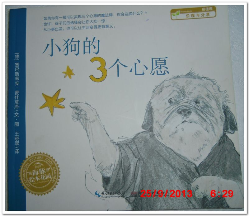 阅读时间:1月10日 阅读心得:在阅读这本书前,你是否也同我们一样,很好奇小狗的三个心愿是什么呢?是的,看到这个题目,宝宝就被封面上逼真的小狗形象和内容所吸引,因为他想知道小狗的心愿会是什么? 内容讲述的是小沙皮狗一觉醒来就很晚了,它睡过头了,可早餐需要吃的麦片没有,咖啡没有,可谓是要什么没有什么,就这样还遇上了下雨的天气。小狗想看报纸了,可门口的报纸也被淋透了,唉,碰上这样的一天,真是糟糕透了。可幸运的是小精灵出现了,小精灵可以满足小狗三个心愿。 三个心愿会是什么呢?本书最值得宝宝期待的看点来了,嘻嘻,原来小沙皮狗也像小朋友一样呀,可爱的小沙皮狗的要求实在是太低了,虽然有点出乎我们的意料,但也在情理之中,因这样才可以吊足读者的口味,引人入胜。 非常可爱的一本书,让小孩子懂得生活中就是由许许多多的小事情做起的,让孩子以乐观的精神迎接生活! 本作品未经作者许可不得转载,转载请征求作者意见。擅自转载使用,将保留追究其法律责任的权利! 评分记录