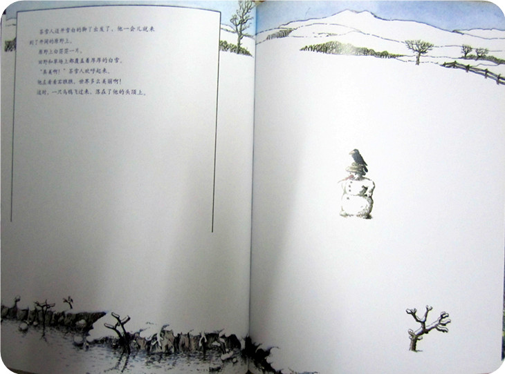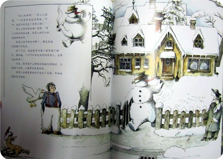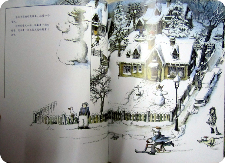 这是一场大雪过后,就像我们的前几天一样!不过这雪可比我们的那场雪大多了!世界变了样子,到处都是白茫茫的,院子中那个背对着我们的雪人,就是封面上刚刚迈着大步行走的雪人吧,这时的他看起来和其他雪人真的没有两样!安安静静的站在那里!