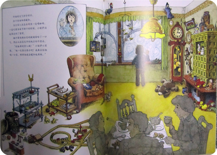屋子外面时冰天雪地,屋子里面却是暖意洋洋,小娄对屋子里的玩具很感兴趣,一样样细数着,小火车、小厨房、各种各样的钟表……好多好多新奇的东西啊!窗边的小孩子是谁呢?她为什么没有和家人一起喝着热饮,吃着点心呢?原来她是丽莎,小丽莎,她看到窗外站着的雪人,心想:“他一定很冷吧?!我要给他喝一口热茶,让他暖和起来。”