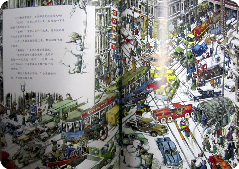 能够自由行走的雪人来到大街上,这无疑是一个让人震惊的奇观,可想而知随之而来的就是一片混乱,交通堵塞、人们都驻足观看。小娄在这本书中,最喜欢这一页了,因为有很多热闹可以看,像开车的木偶、等车的小丑和鳄鱼等等……幸运的雪人遇到了一个男孩,男孩对他说城市不适合他,建议他去乡下!