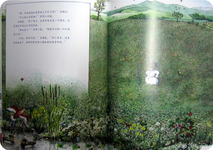 可乌鸦告诉他,等到了夏天这就会变成一片绿色,红花草会开出美丽的红花,雪人兴奋的问,那我可以做红花草人吗?乌鸦否定了雪人的想法,因为到了夏天,雪就会融化成水了!