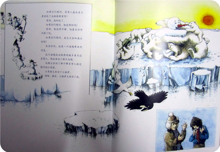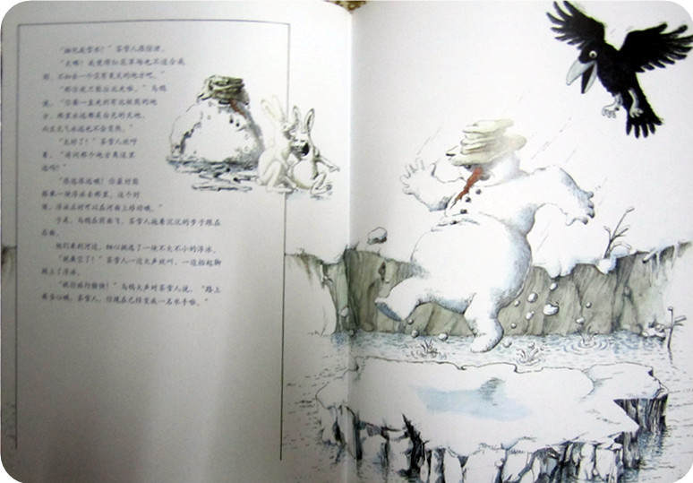 融化?这可不是雪人想要的,看来这里并不适合我!可到底哪里才适合我呢?乌鸦告诉他,你可以往北走,走到有北极熊的地方!那里是永远都不会变热的地方!乌鸦帮助雪人,让他站在浮冰上,就这样顺流而下,一路向北!