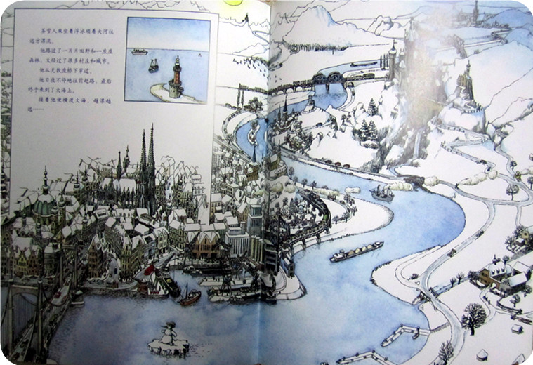 这个画面很熟悉吧!对,这就是封面上的那页,我们找到了雪人拥有生命的原由,原来是丽莎的爱和温暖,让普通的雪人变得不普通!可雪人带着他那不安分的想法要去做什么呢?