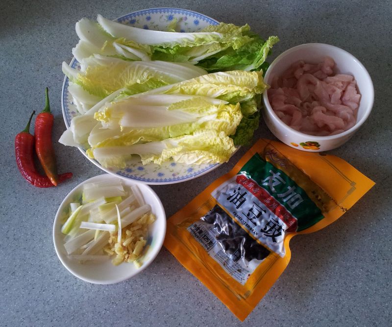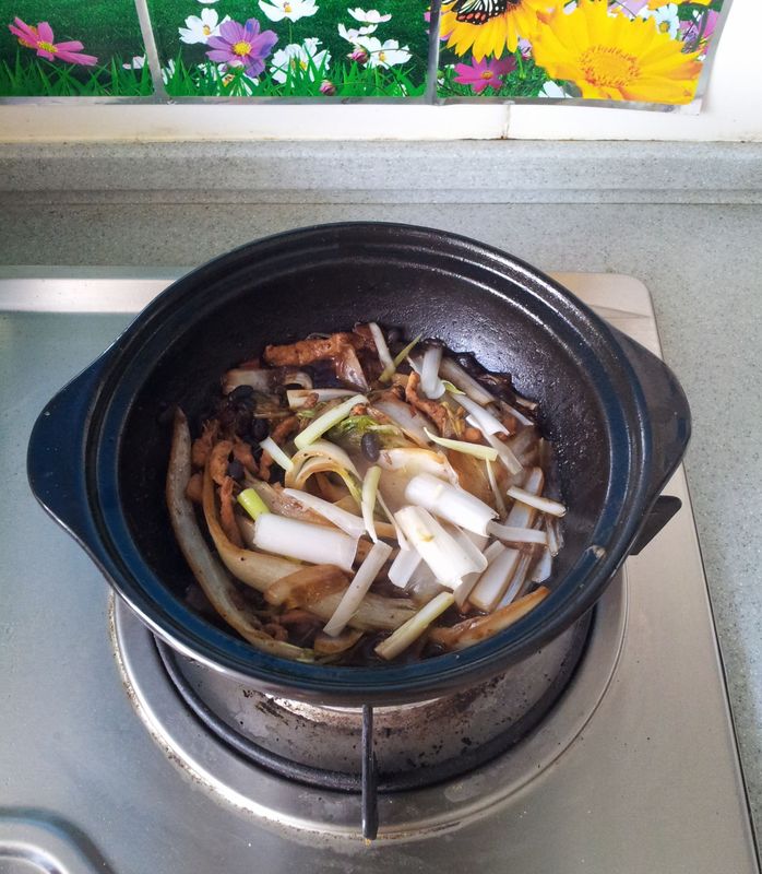 娃娃菜叶子剥下后洗净竖切; 肉丝用料酒腌制,热锅凉油姜末爆香,肉丝迅速翻炒变色后盛出; 红椒(我自己种的,超辣,一个足够)、豆豉下锅爆出香味,翻入娃娃菜翻炒,稍加水; 干锅放火上,涂一层橄榄油; 八成熟的娃娃菜倒入干锅,小火,渐渐把水熬干(小心别糊锅),加少许盐和葱段; 连锅一起端上桌吧。