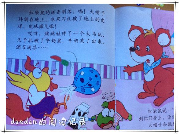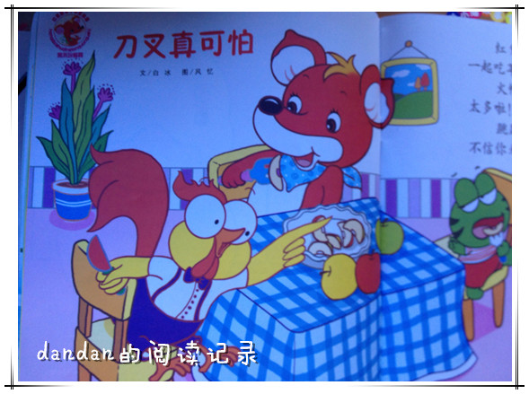 ![]() 阅读日期:1月11日 参与人员:妈妈和宝宝 阅读绘本:《婴儿画报:刀叉真可怕》 绘本特色:培养安全意识 适合年龄:2~4 阅读心得: 小朋友在一起玩的时候总是会有一些接触到危险用品的时候。 比如,用刀叉吃东西的时候,那么,这个故事讲的就是刀叉的威力。 红袋鼠、火帽子和跳跳蛙他们一起在桌旁吃水果,结果跳跳蛙和火帽子又干上了,俩人开始追打起来。可是,却忽略了他俩手中的刀子和叉子。 红袋鼠连忙提醒,小心你们手中的刀叉!话音刚落,火帽子就摔倒了,水果刀把皮球扎破,皮球憋了。然后跳跳蛙也摔倒了,叉子扎破了牛奶盒,盒子里的牛奶流了出来。 红袋鼠说,还好刀叉没扎到你们身上,不然就流血了。 ![]() 可以想见,这样的场景在小朋友们忘情玩耍的时候多容易出现。所以要时刻提醒这些捣蛋鬼们,危险的东西不能拿在手上玩,尤其不能追打的时候玩。安全意识的教育很重要哇!另外家长们也不能让小孩子们单独玩这些刀刀叉叉。 本作品未经作者许可不得转载,转载请征求作者意见。擅自转载使用,将保留追究其法律责任的权利! 个性签名
