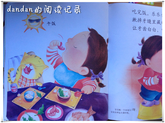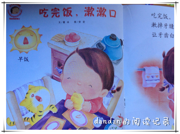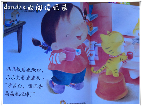 ![]() 阅读日期:1月12日 参与人员:妈妈和宝宝 阅读绘本:《婴儿画报:吃完饭,漱漱口》 绘本特色:培养口腔好习惯 适合年龄:2~4 阅读心得: 吃完饭漱口,是一个好习惯,可以保持口腔清洁,以免蛀牙。 乐乐就在故事里为大家树立了这样一个好榜样,从早饭开始到午饭、晚饭。一吃完饭就用水漱口,最后她还给妈妈看了她的一口好牙齿。 ![]() ![]() 蛋蛋的刷牙训练从一岁多开始,开始是指套牙刷,后来是用儿童小牙刷。话说他还挺喜欢玩刷牙的游戏,不过有一半的时间都是在用牙刷玩水,哈哈。但是这样的习惯应该继续坚持下去,貌似目前还不会漱口,水只会吞,不会吐。还要多训练呀~~~过阵子给他上牙膏。 这个故事里还有一个有趣的细节,就是把乐乐的三餐都画了出来。早餐是面包和水果,午餐是饭配各种菜,晚餐是香菇鸡蛋鲜虾面。种类丰富又营养美味,看的我都想吃了~~~看来小朋友的伙食还是丰富多彩比较容易吸引他们的食欲呀! 本作品未经作者许可不得转载,转载请征求作者意见。擅自转载使用,将保留追究其法律责任的权利! 个性签名